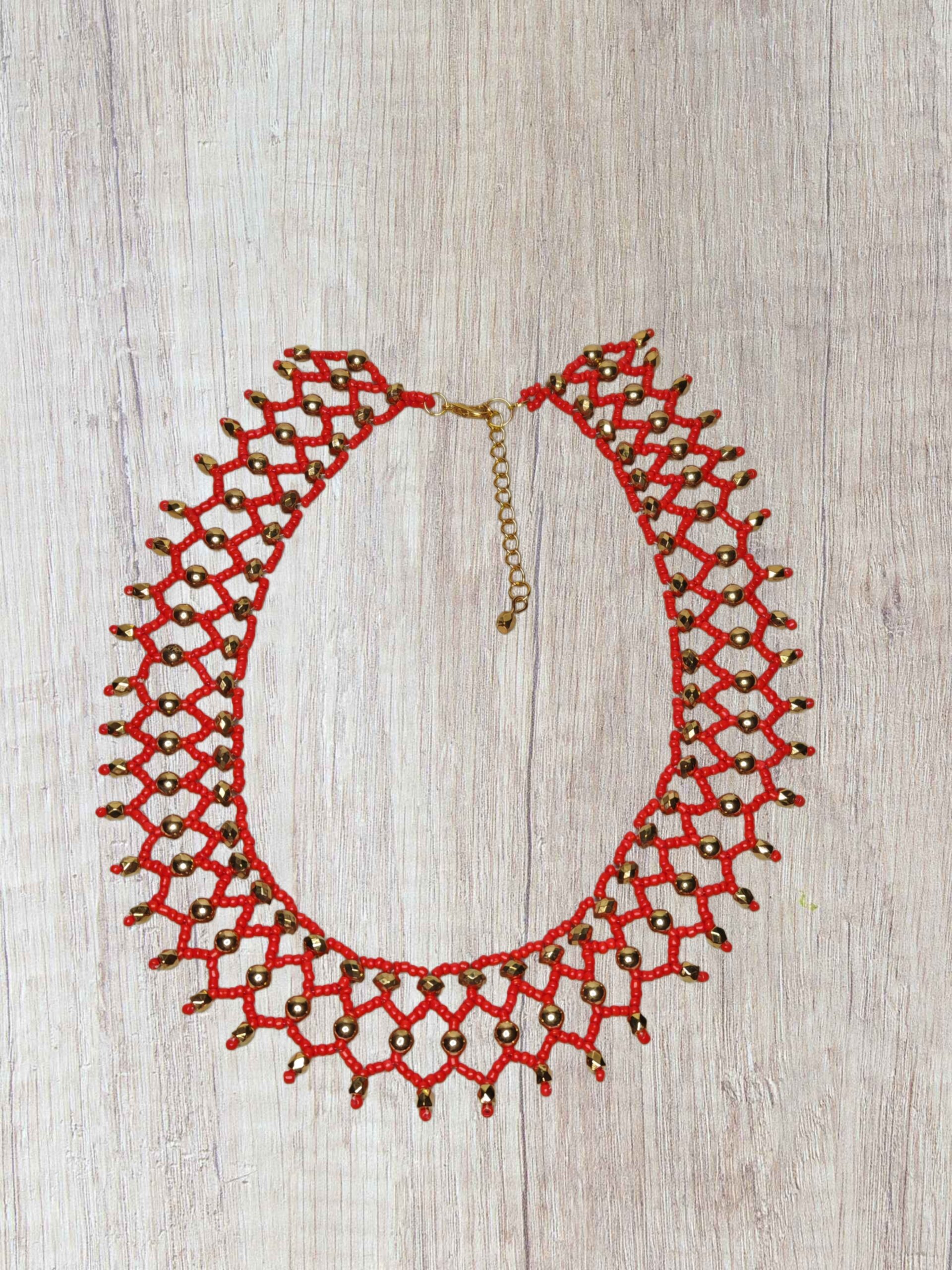 Deze ketting is handgemaakt van kleine kraaltjes in rood en goud. Het ontwerp heeft de vorm van een delicaat gaas met driehoekige motieven die een prachtige kantstructuur rond de hals vormen. De gouden kraaltjes zorgen voor een elegant en glamoureus accent, terwijl de rode kralen een gevoel van warmte en energie creëren. De ketting heeft een gouden schakelketting om de lengte aan te passen en een sluiting aan de achterkant. Het is een stijlvol en expressief accessoire, geschikt voor zowel dagelijks gebruik als speciale gelegenheden.