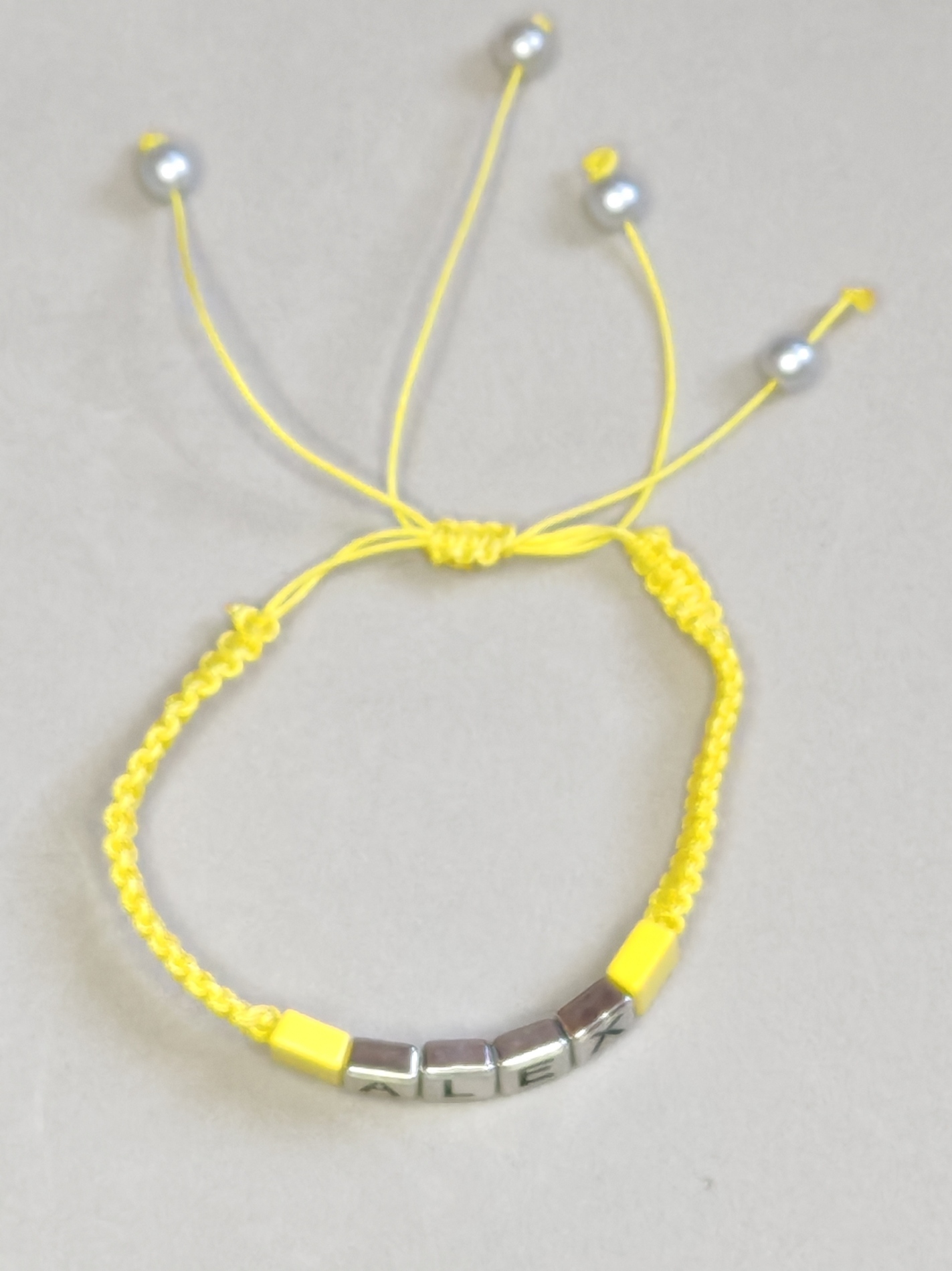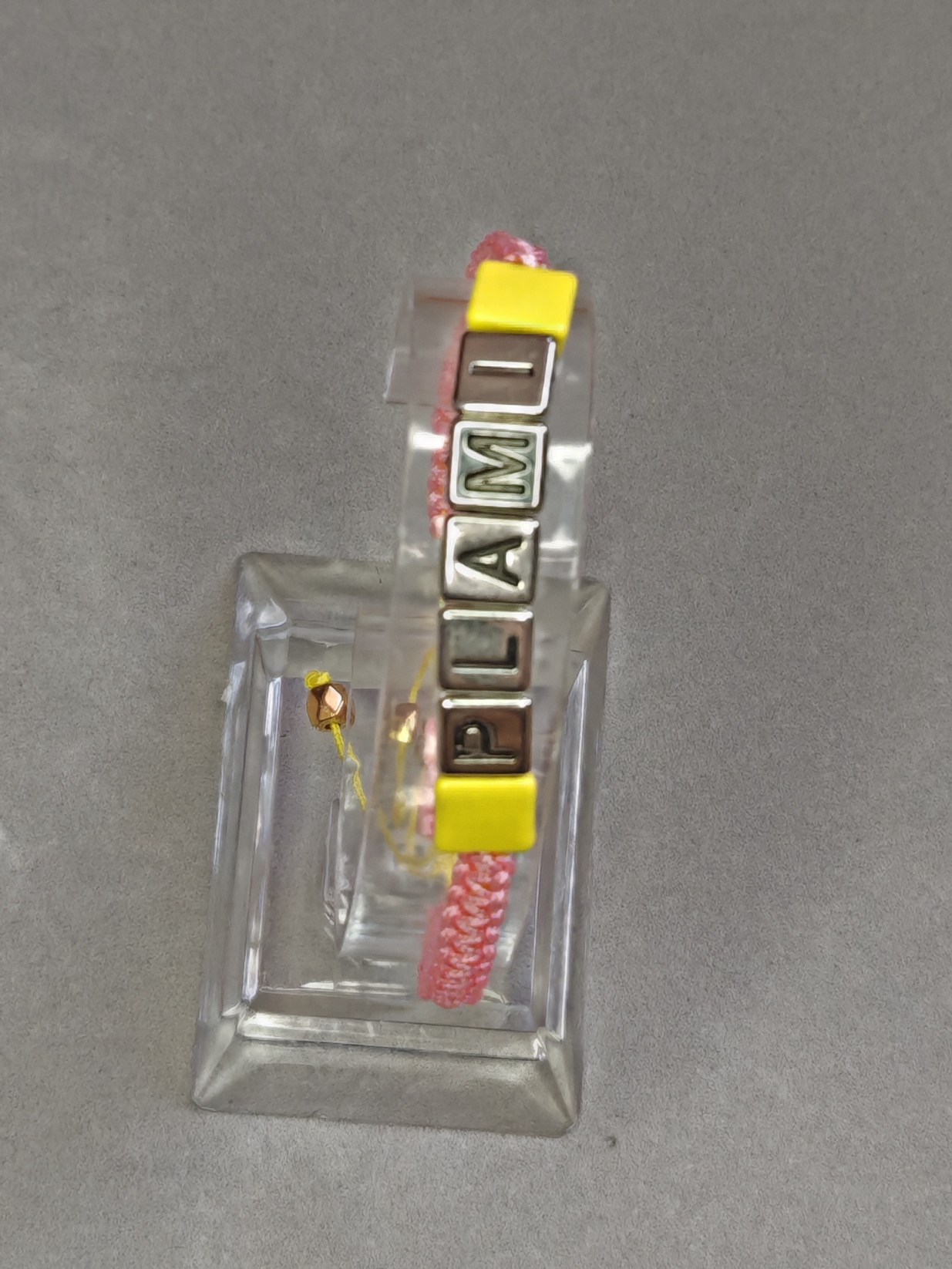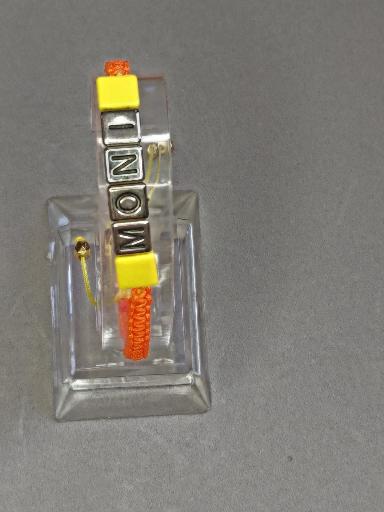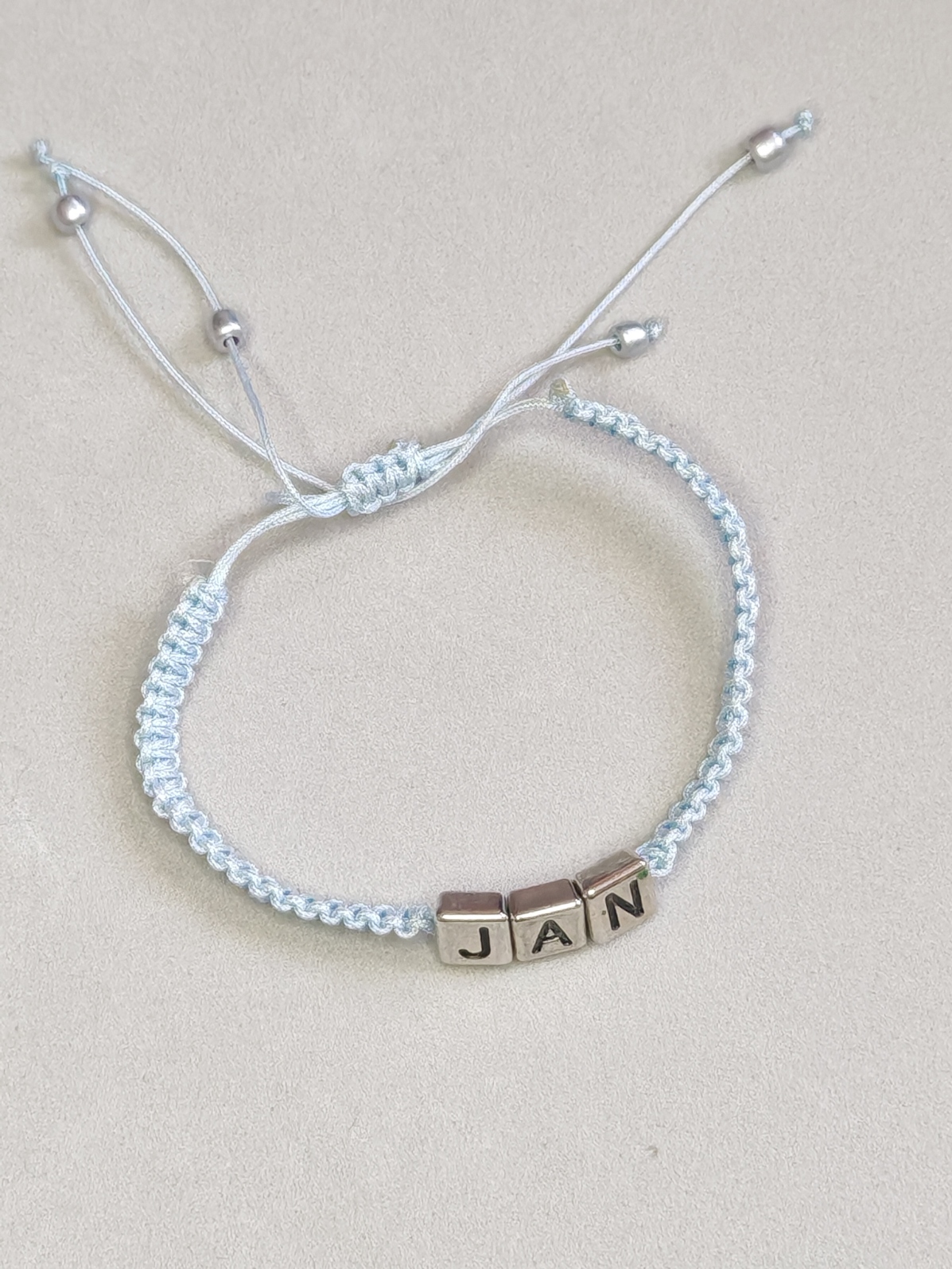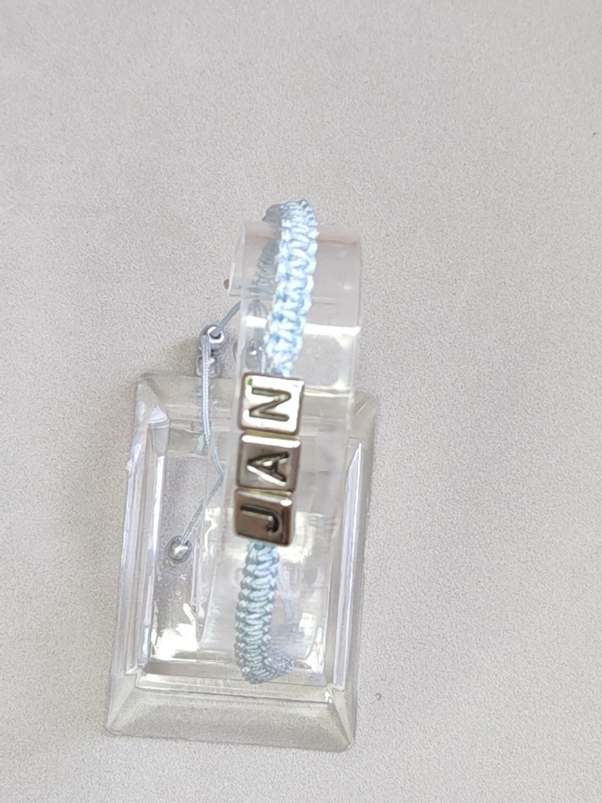 In het midden zijn metalen kubuskralen met reliëfletters geregen. Hij kan worden voorzien van een inscriptie naar keuze en kleur.