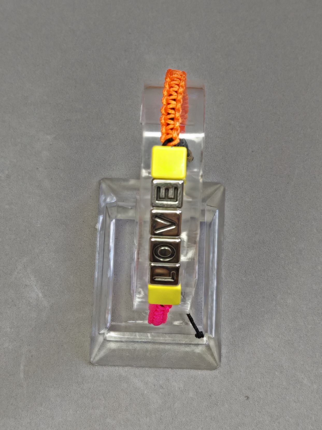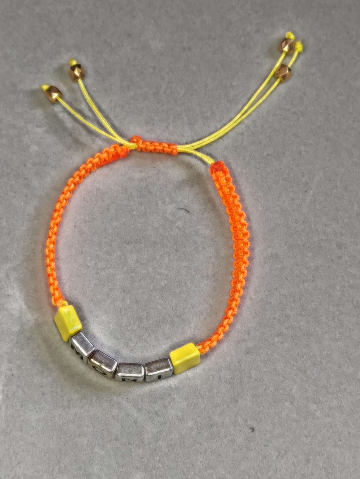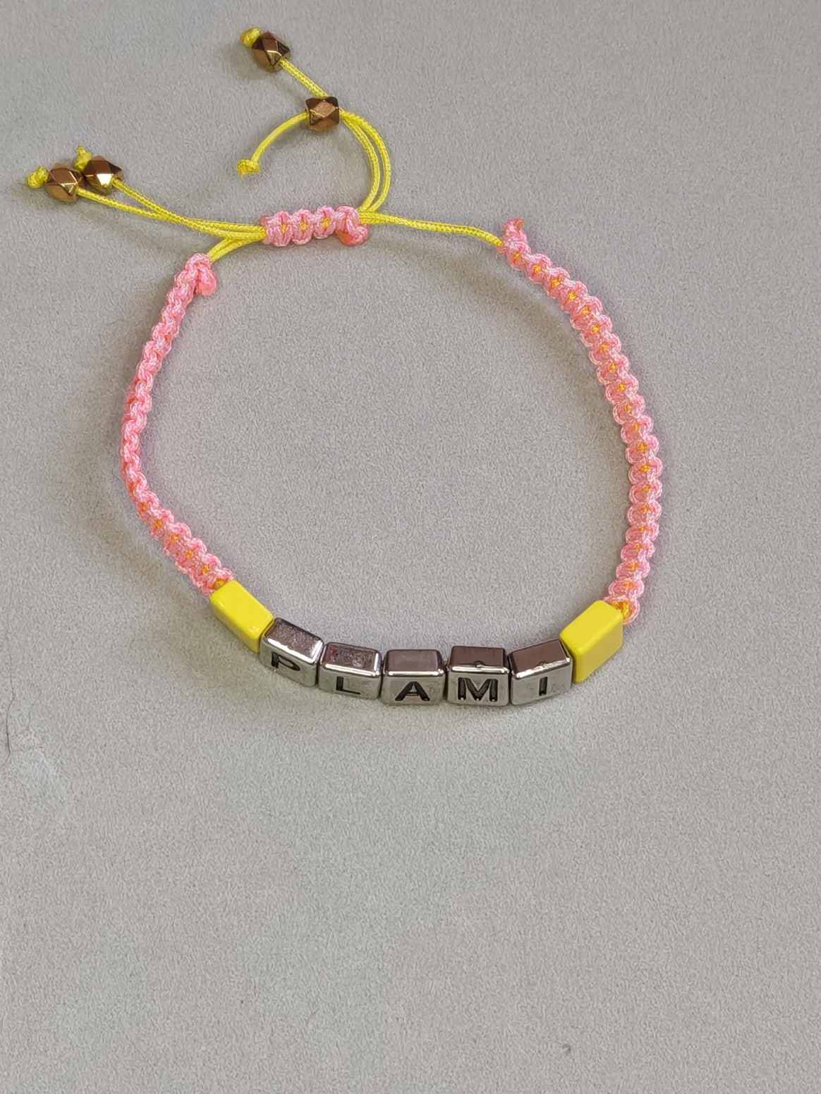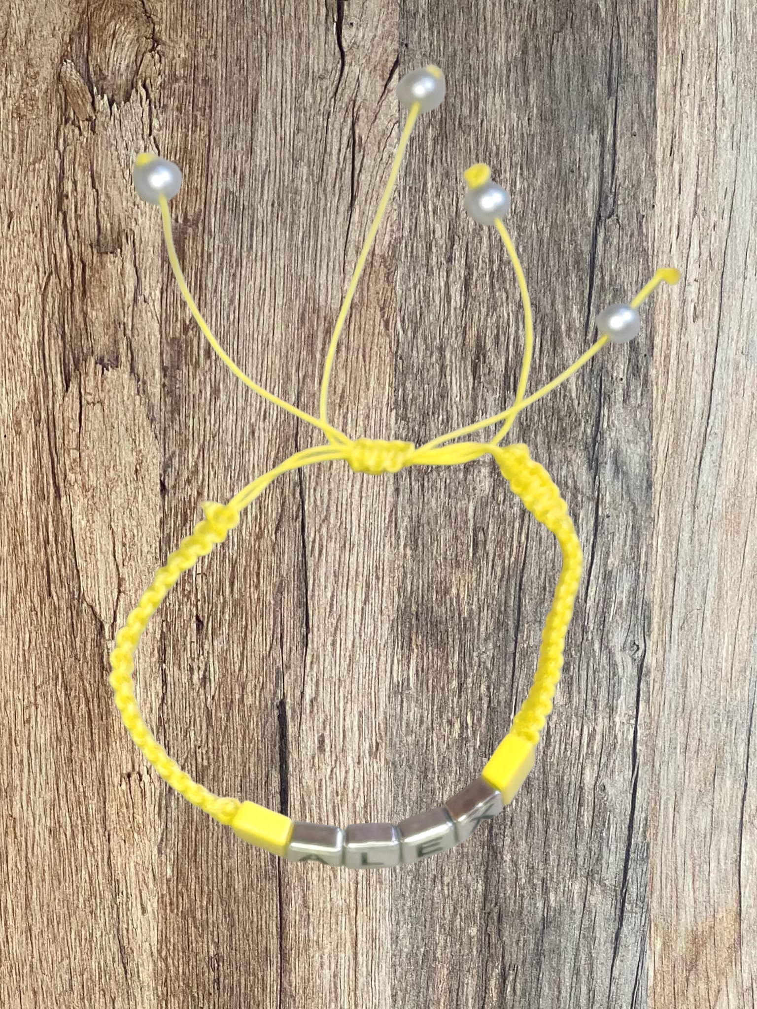 In het midden zijn metalen kubuskralen met reliëfletters geregen. Hij kan worden voorzien van een inscriptie naar keuze en kleur.