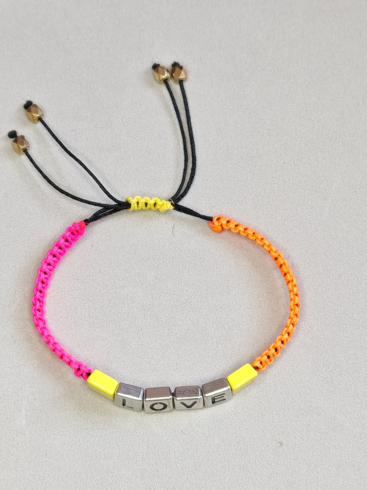 De armband is handgemaakt en is aan de bovenkant met macramé geweven. Hij eindigt met vier losse schakels, wat hem een ​​elegantere en afgewerkte look geeft.