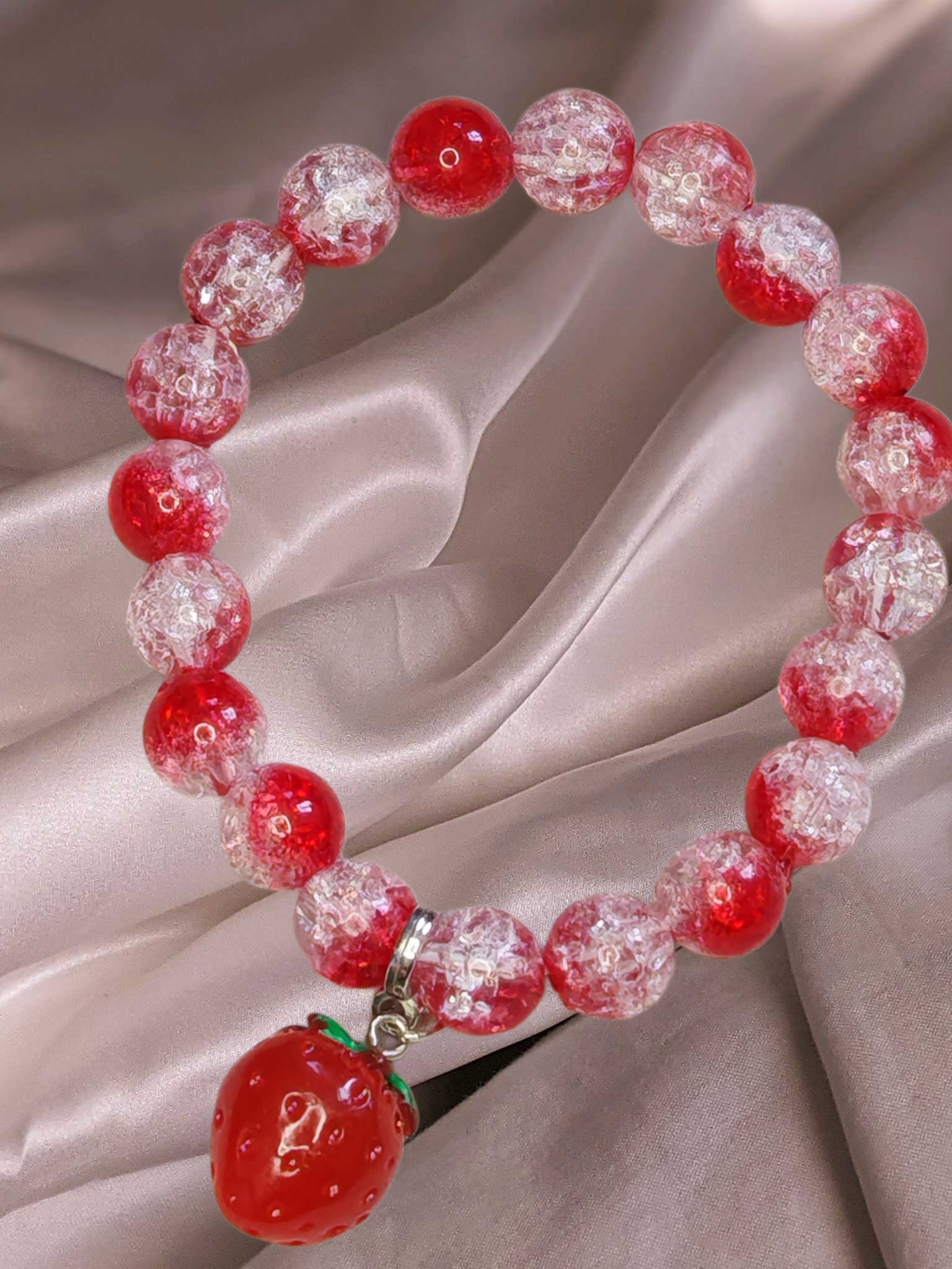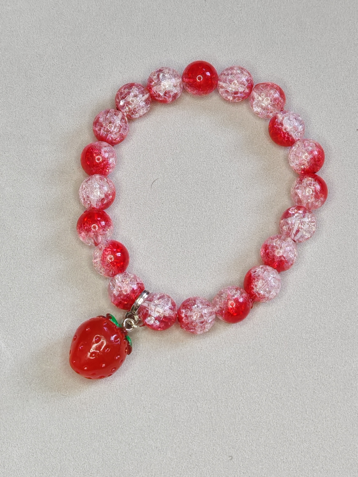 De armband is gemaakt van afwisselend rode en transparante kralen met een gebarsten effect, dat doet denken aan ijskristallen. In het midden hangt een klein bedeltje in de vorm van een sappige rode aardbei met een glanzende afwerking en groene bloemblaadjes. De combinatie van felrode en transparante elementen geeft de armband een fris en speels effect, dat doet denken aan ijs, een aardbeienmilkshake of een zomers dessert. De armband is elastisch en geschikt voor zowel dagelijks gebruik als als accent bij een jeugdige of artistieke stijl.
