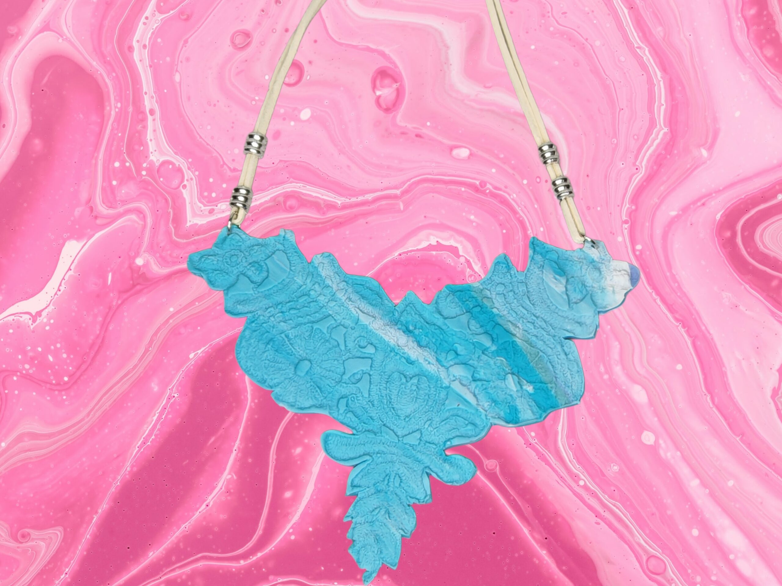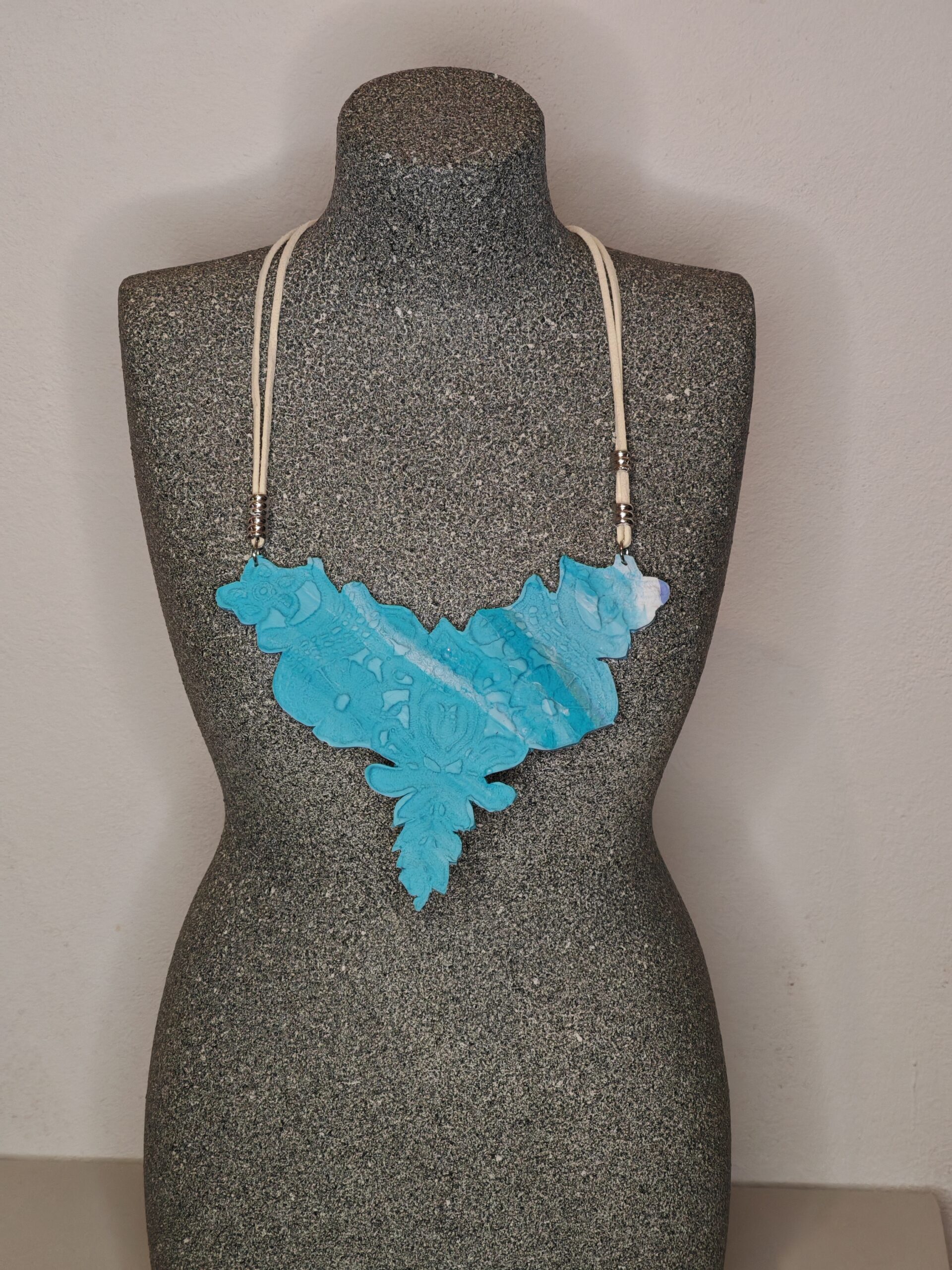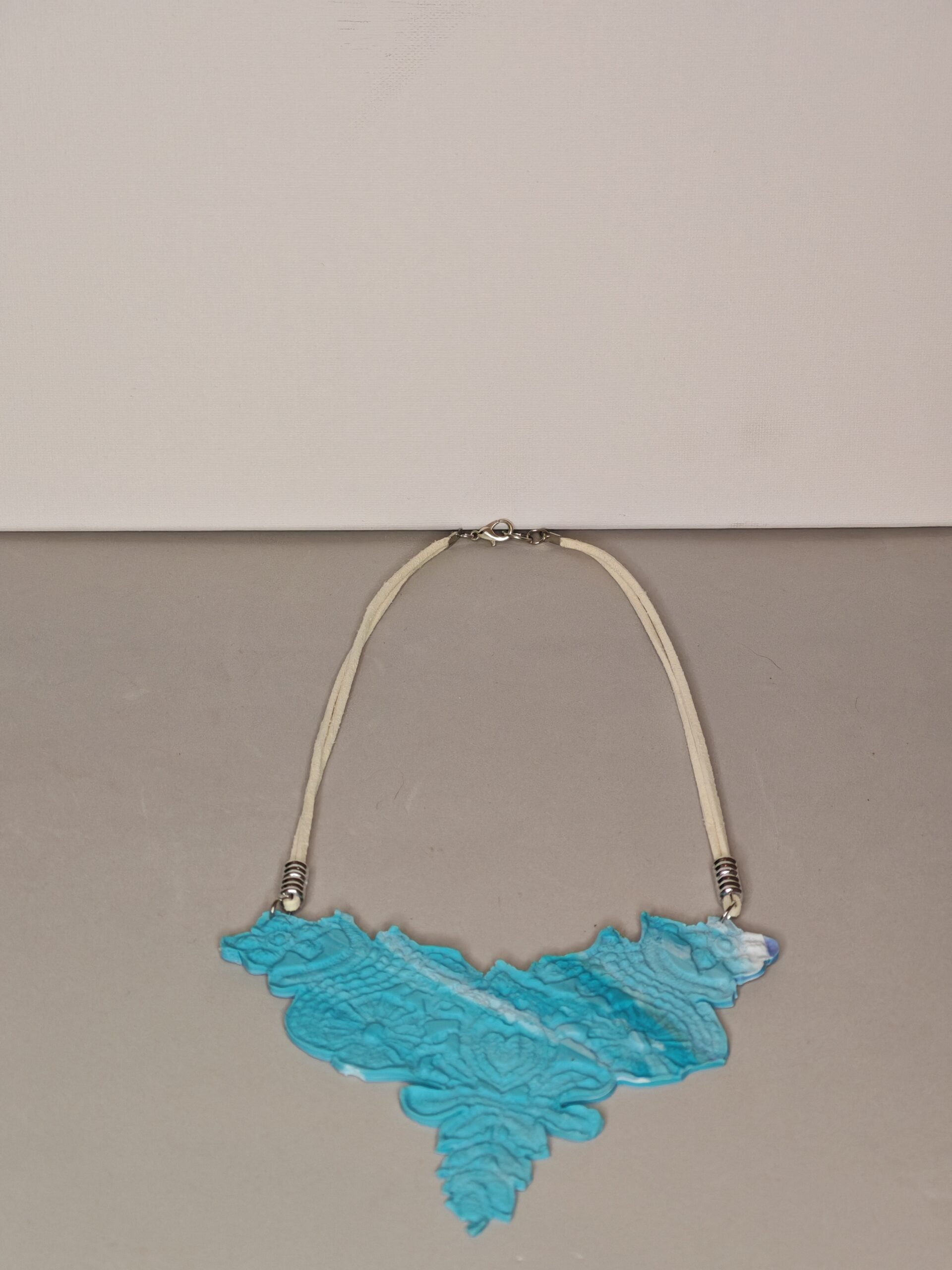 Een excentrieke ketting van polymeerklei in verschillende blauwe tinten. Het bandje is van suède.