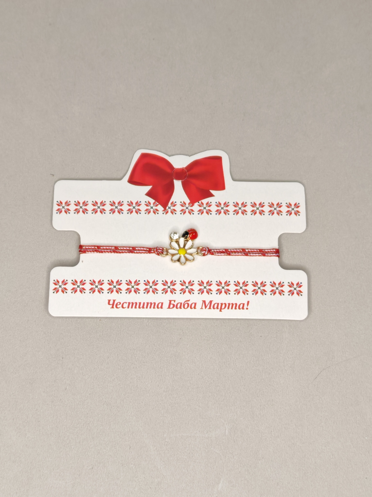 Bloem met lieveheersbeestje en klein steentje met dun wit en rood touwtje.