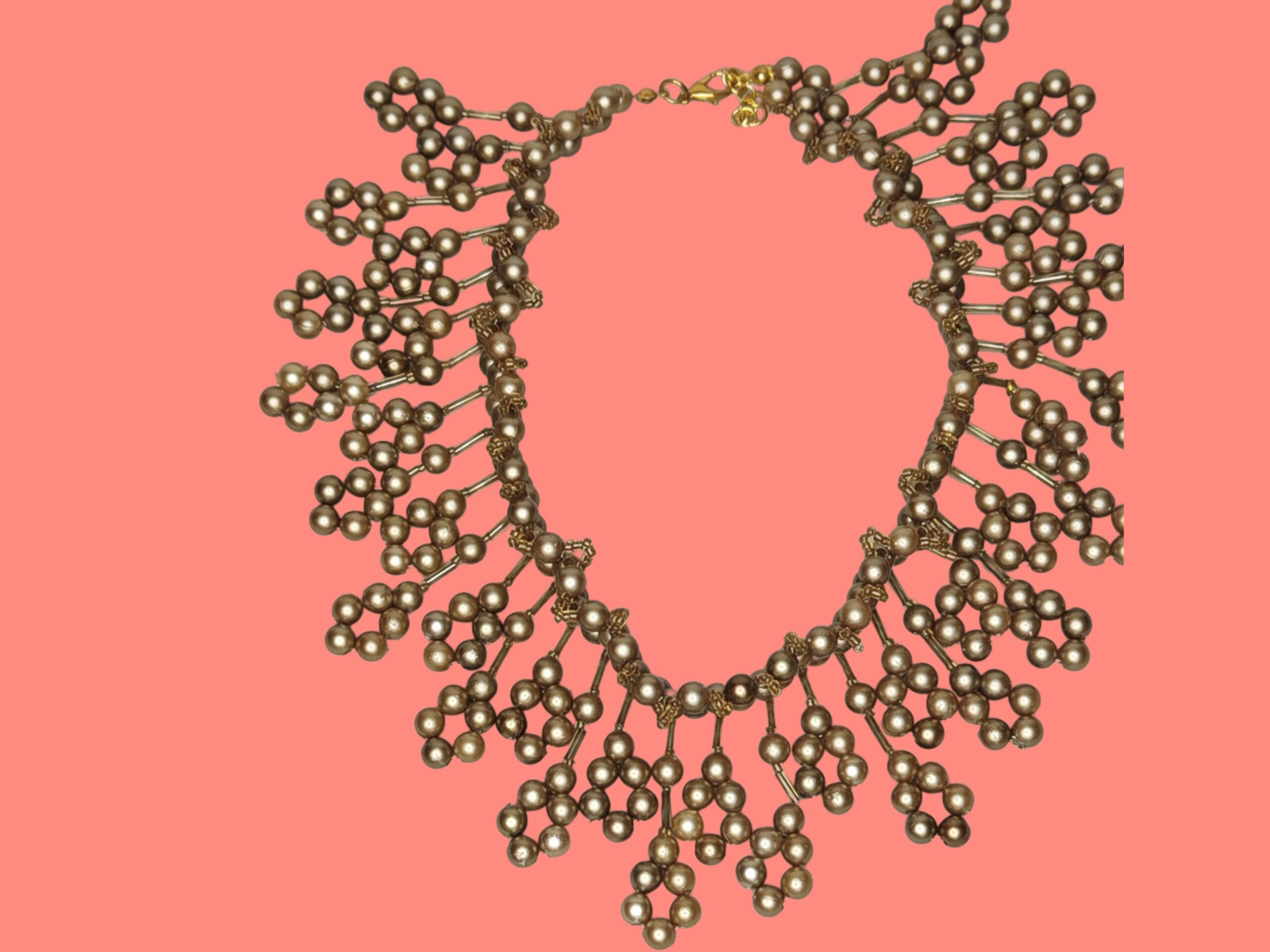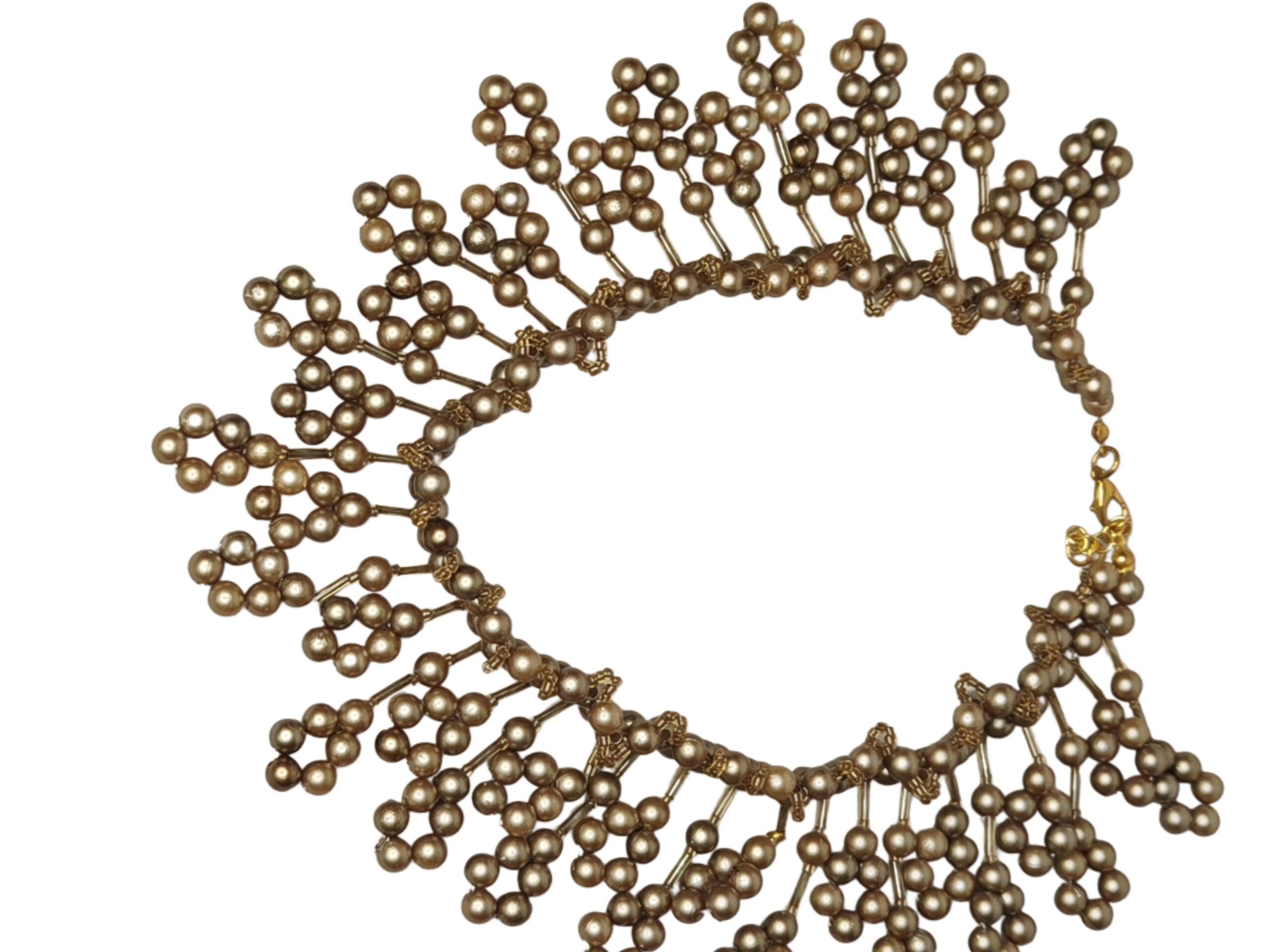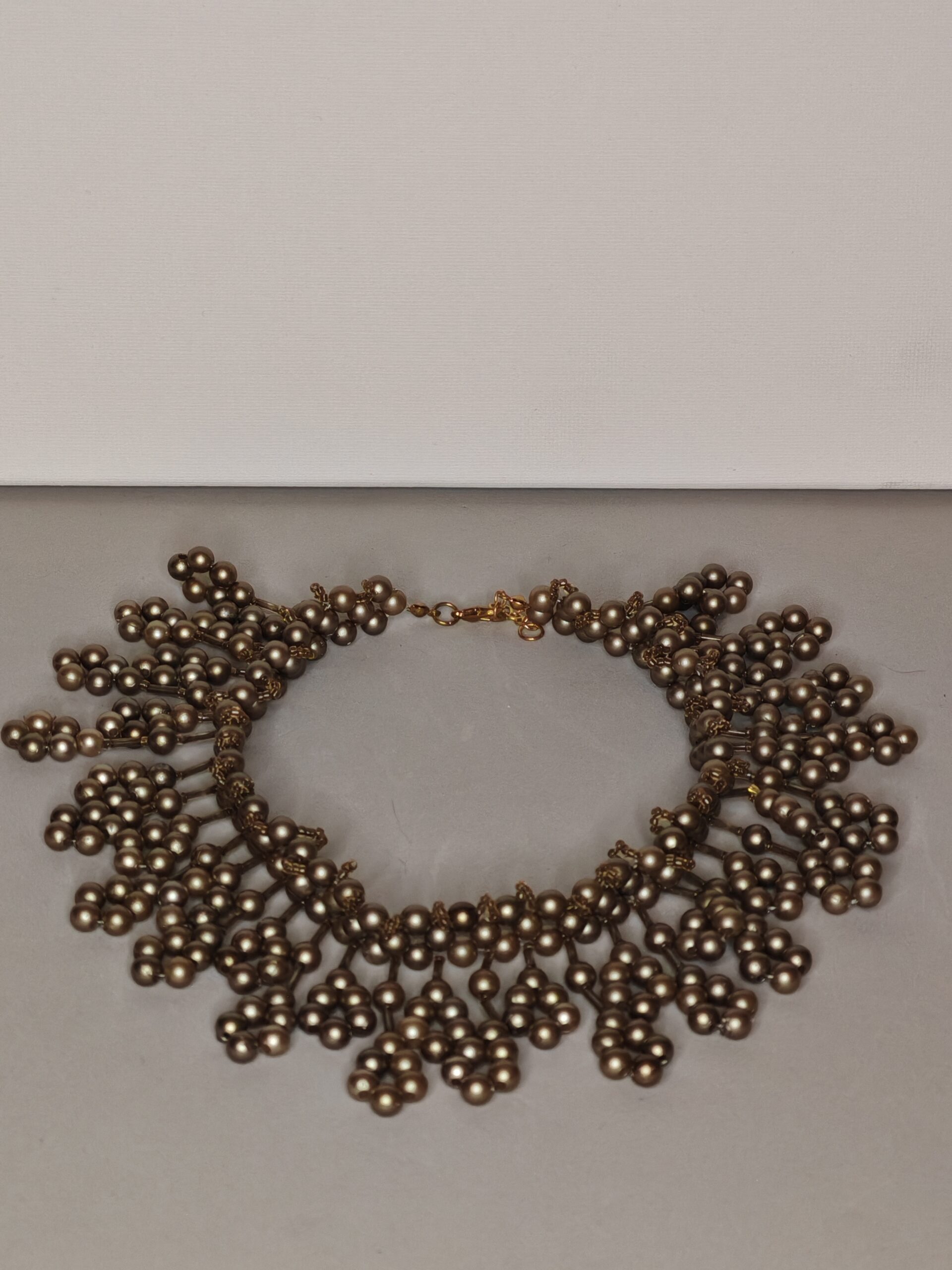 Opvallende statement ketting opgebouwd uit meerdere bronskleurige kralen in een rijke, gelaagde compositie. Krachtig en stijlvol design dat direct de aandacht trekt en ideaal is voor avondlooks en speciale gelegenheden.