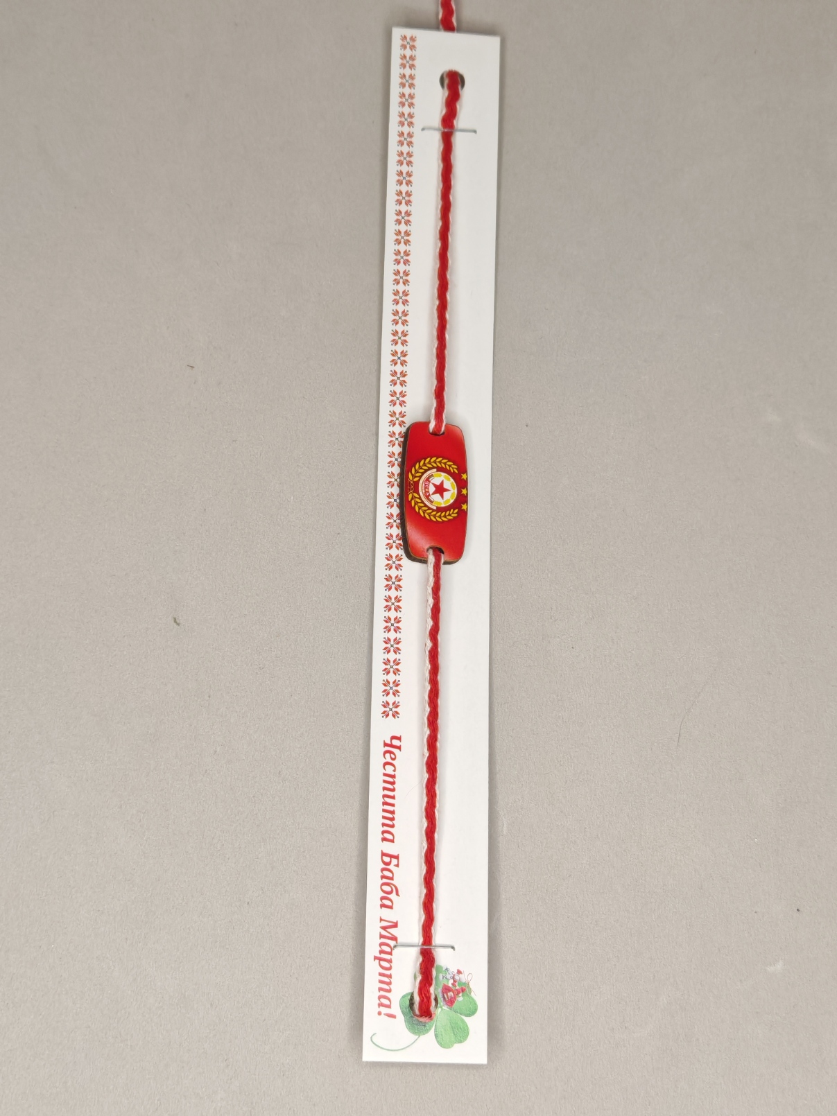 Houten CSKA-figuurtje met dun, in elkaar gevlochten draad in wit en rood.