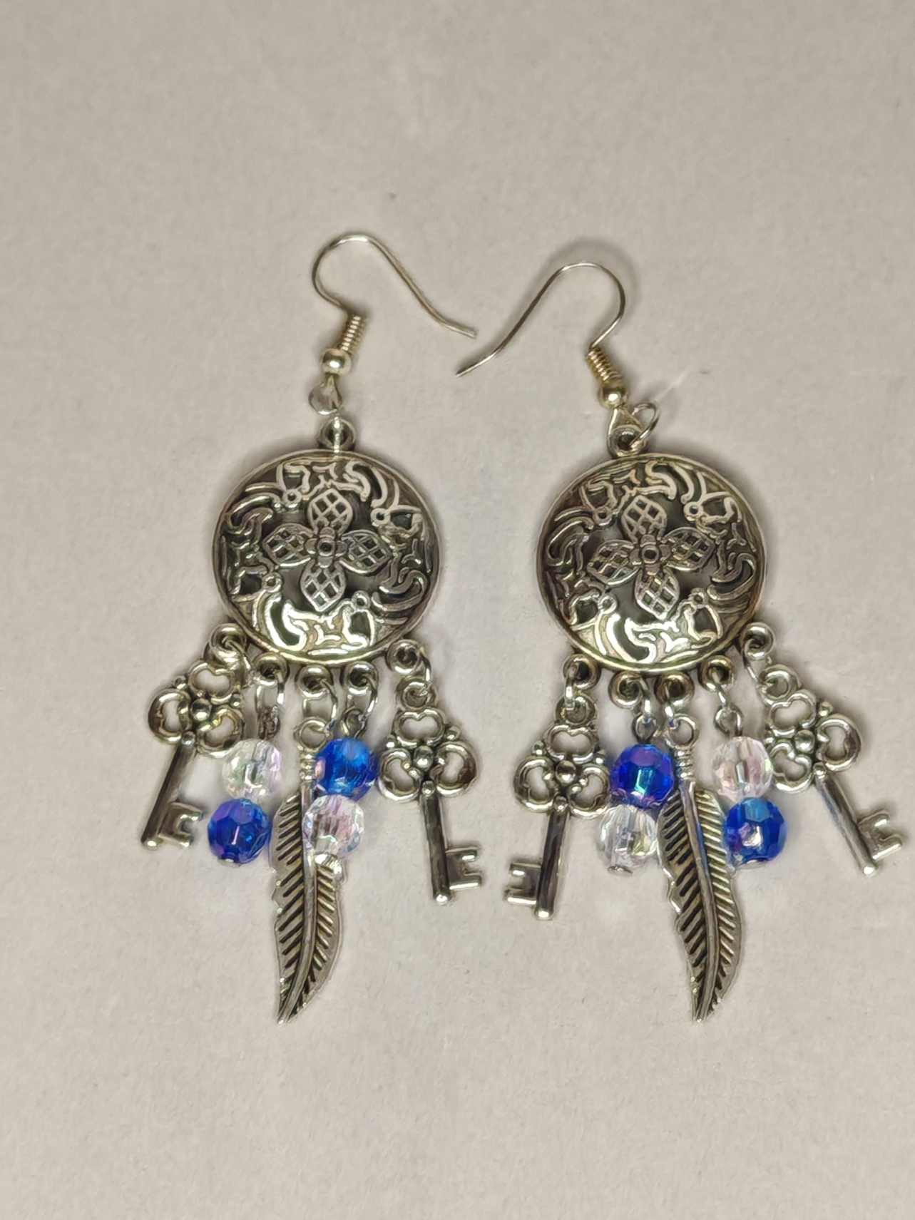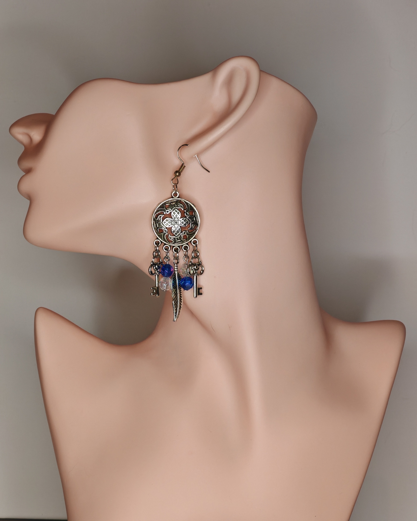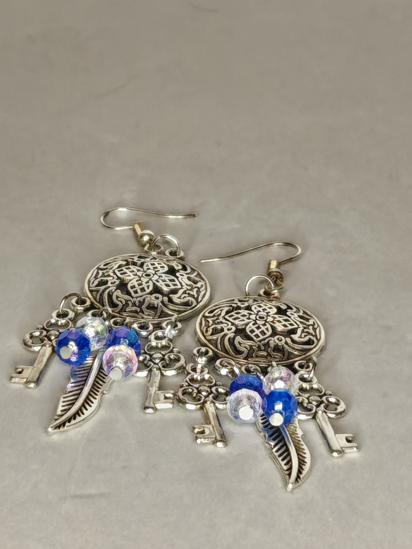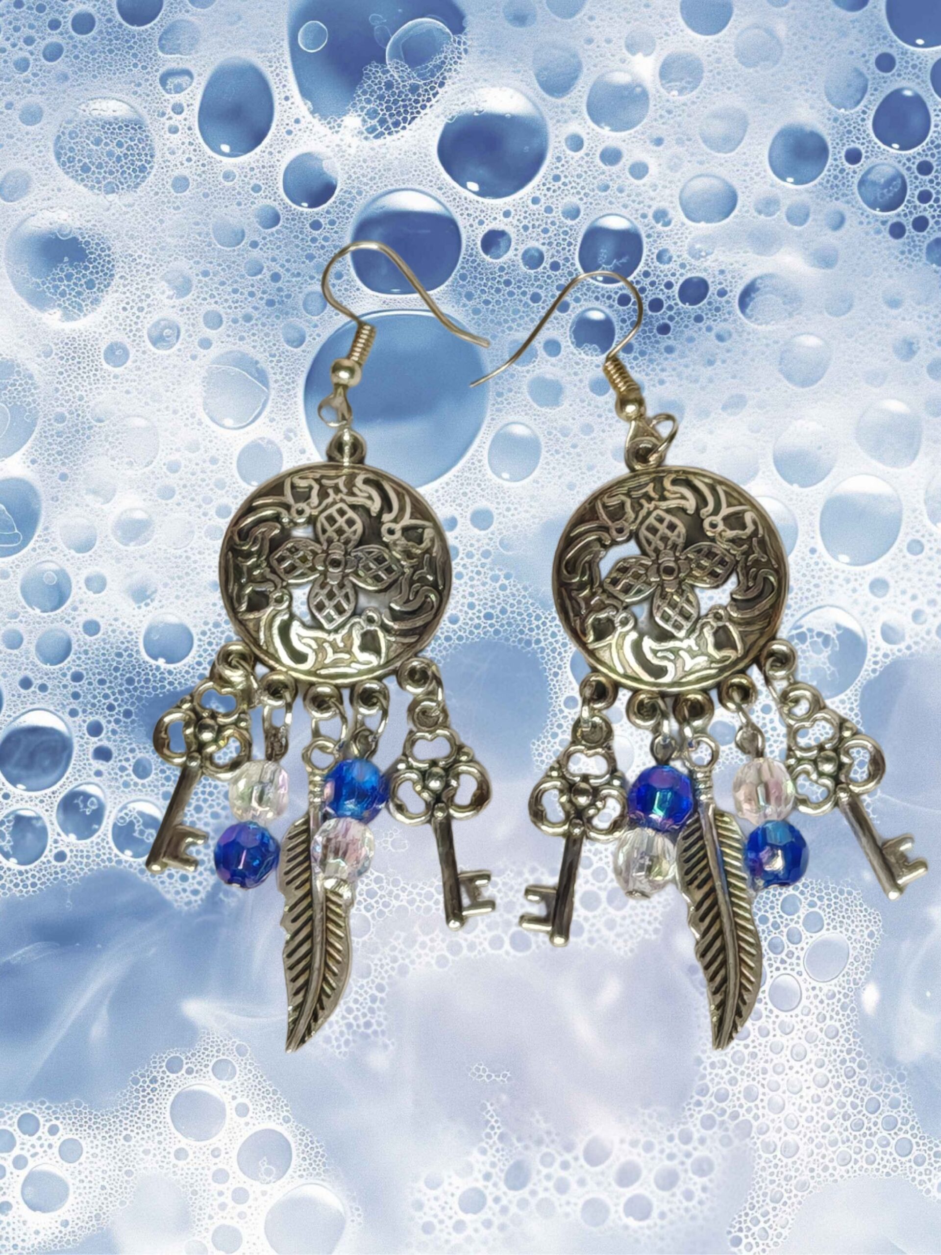 Deze oorbellen lijken op amuletten die gevonden zijn in de kist van een reizende magiër. De zilveren cirkels met prachtige ornamenten bewaren onuitgesproken gevoelens, de veren – herinneringen aan verre werelden, en de sleutels – deuren die nog niet geopend zijn. Wanneer ze bewegen, klinkt hun rinkelen als een eeuwenoude spreuk die intuïtie ontsluit en de avontuurlijke geest wakker maakt.