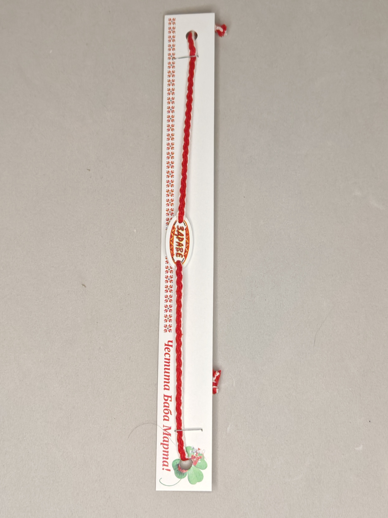Houten beeldje met de tekst “Gezondheid” en een dun wit en rood koordje.