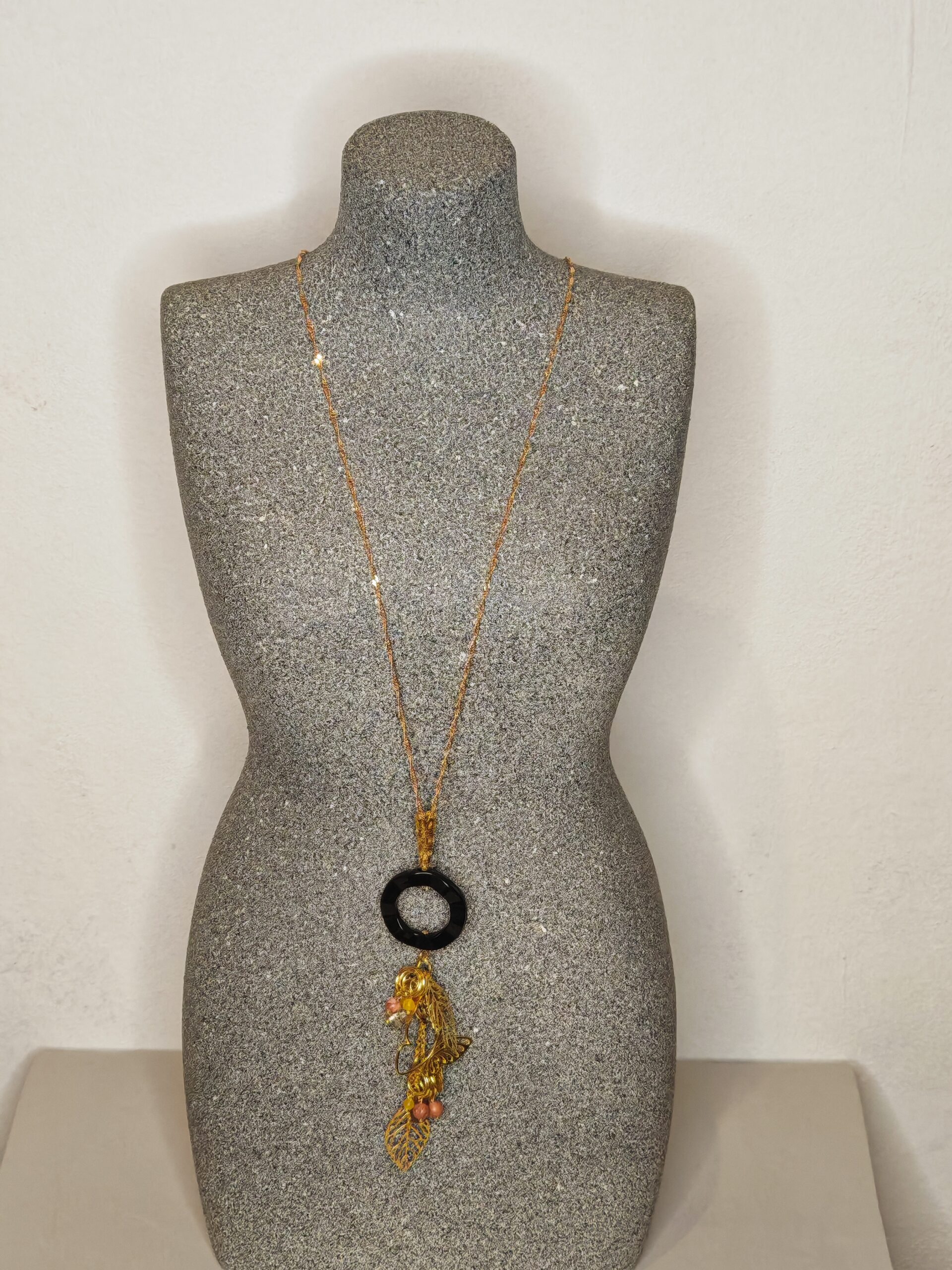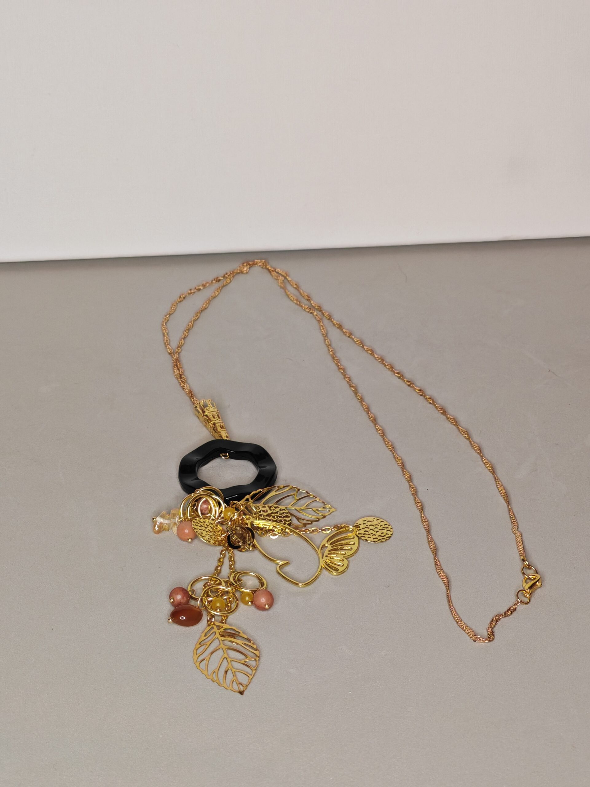 Artistieke statement hanger met goudkleurige bladeren, fijne kettingen en natuurstenen accenten. Het asymmetrische ontwerp en de rijke details geven dit sieraad een luxe, bohemian uitstraling met een moderne twist.