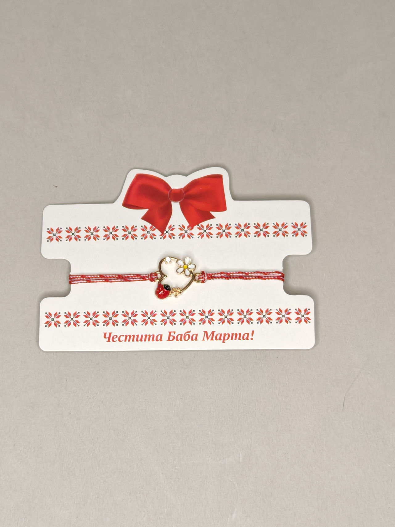 Hartvormig beeldje met een bloem en een klein steentje, met een dun wit en rood koordje.