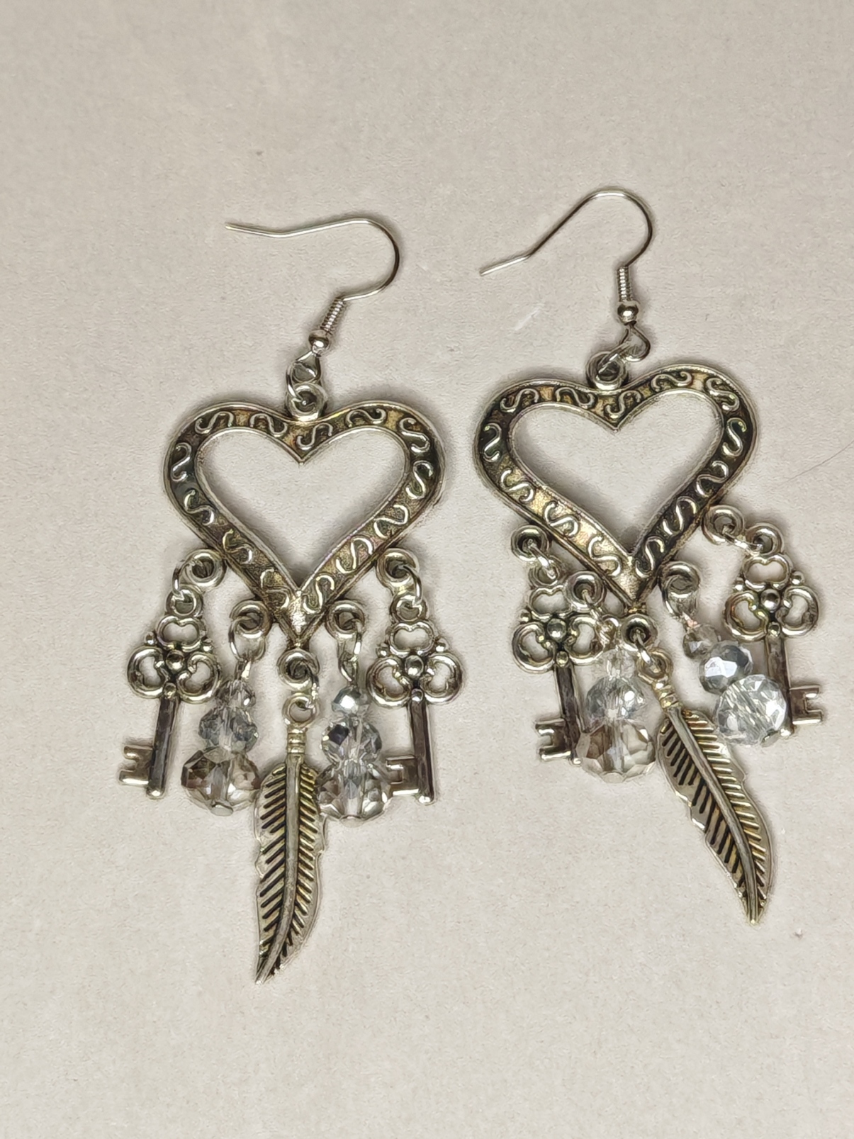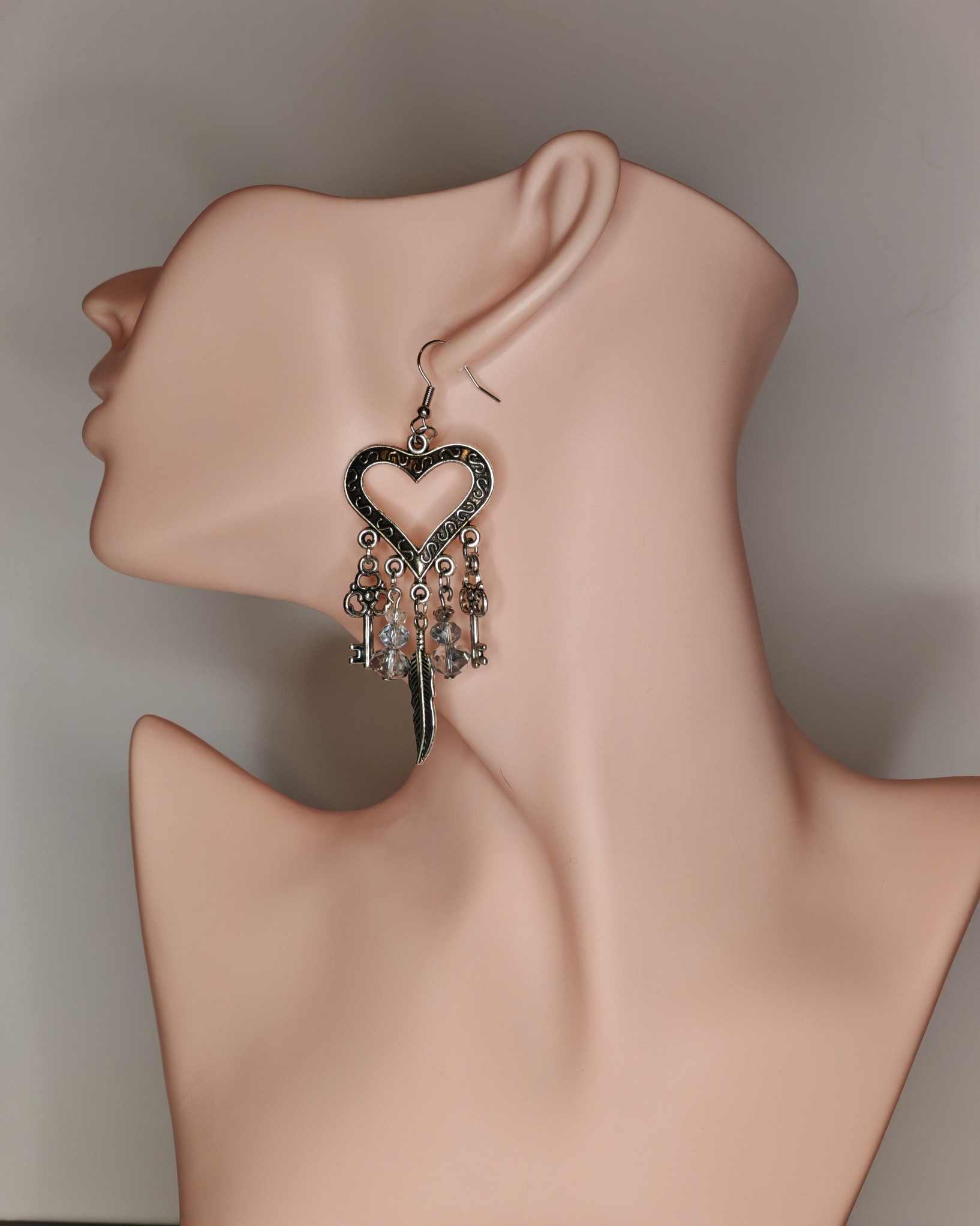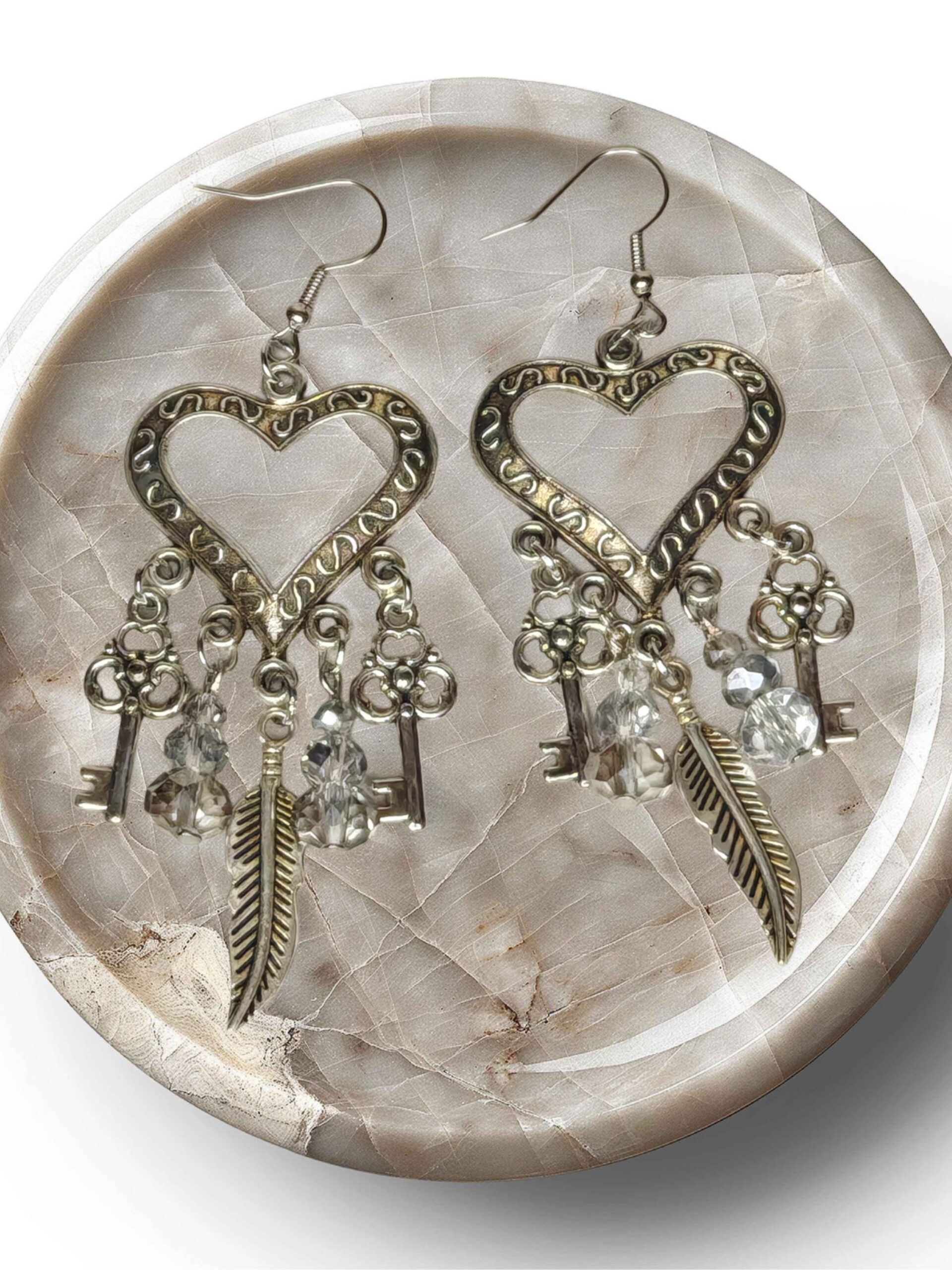 Zilveren oorhangers aan een haakje, met een groot hol hart als hoofdelement. Versierde hangers hangen eraan – veren, kristallen kralen en kleine sleuteltjes. Rijke, boho-romantische stijl.
