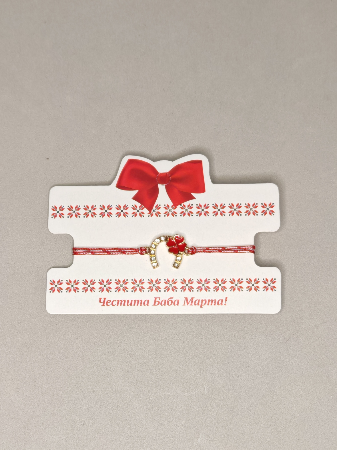 hoefijzerfiguur met rode klaver en dun wit en rood koord
