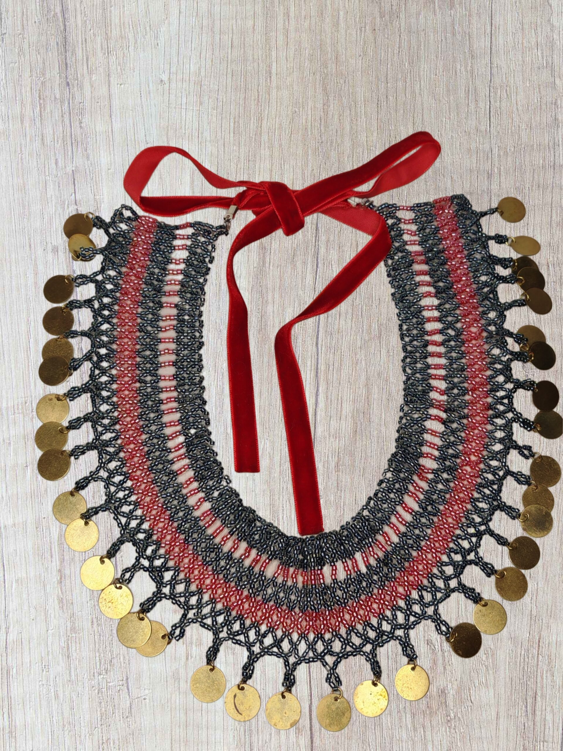 Deze expressieve ketting is handgemaakt van kralen in rode en donkerblauwe tinten, geweven in een prachtig kantpatroon. Hij is afgewerkt met een reeks gouden ronde elementen die beweging en oosterse charme toevoegen. Hij wordt vastgemaakt met een rood fluwelen lint dat een romantisch en verfijnd accent toevoegt. De ketting is een ideale keuze voor speciale gelegenheden, podiumoptredens of als accent bij een boho- of etnische stijl.