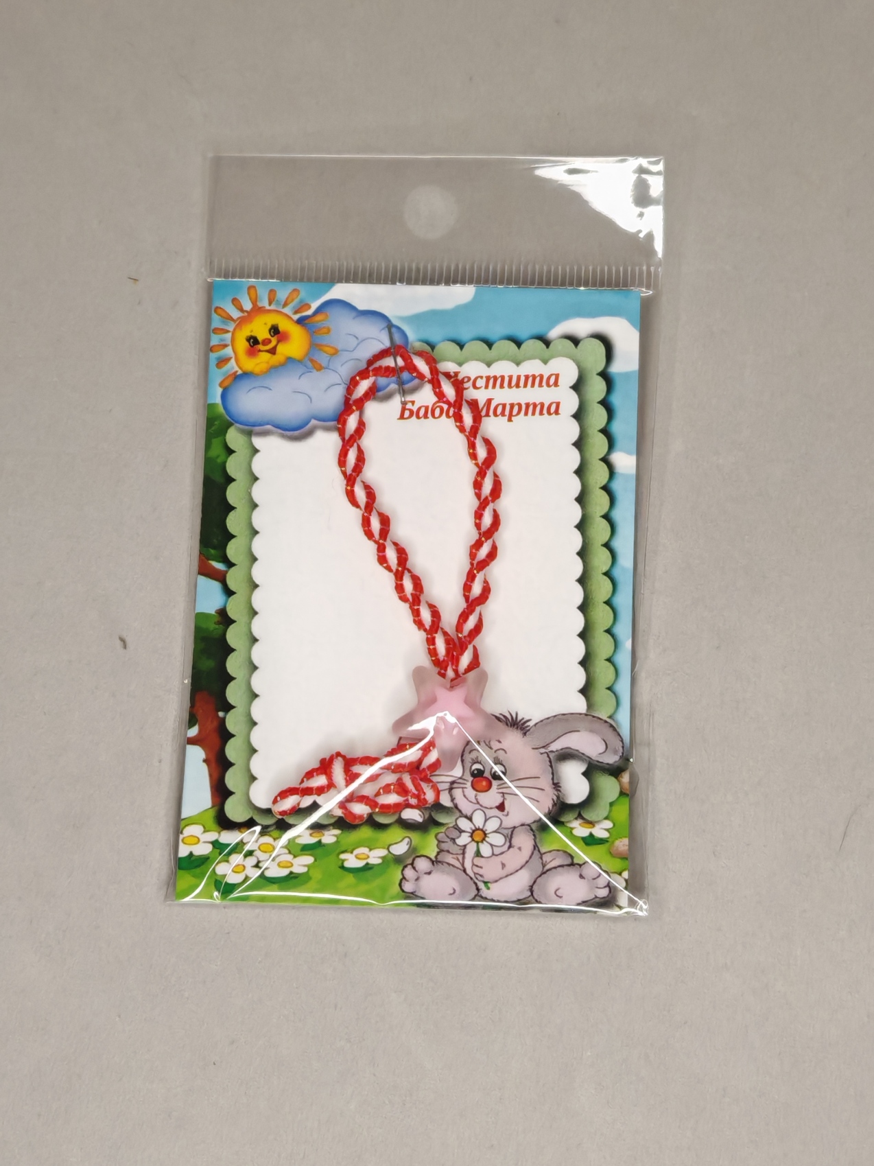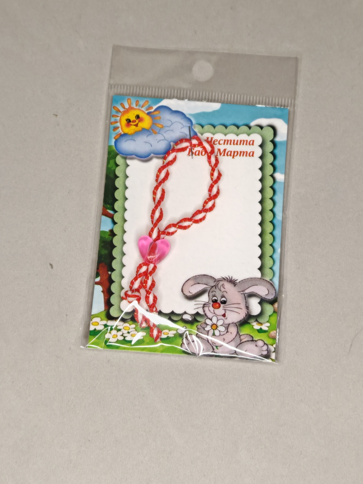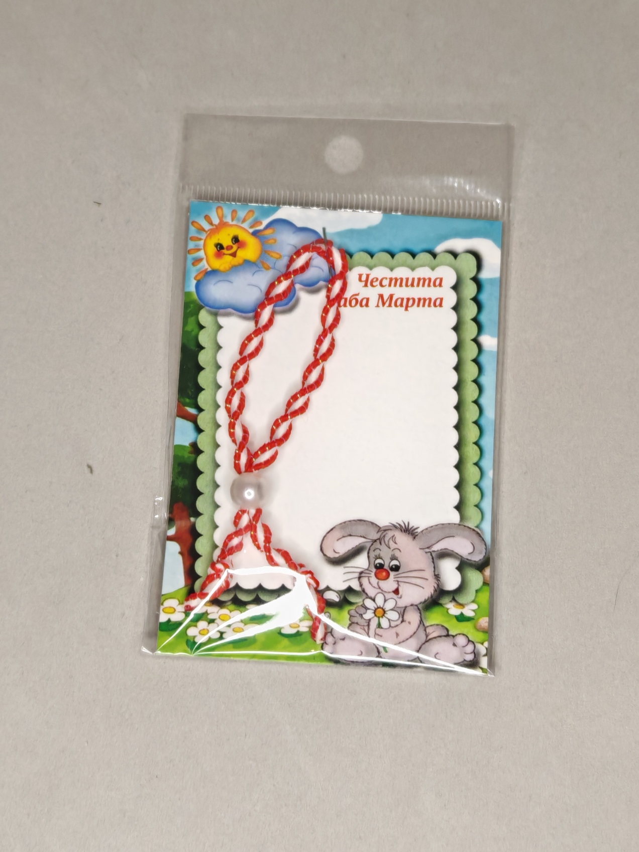 Kindermartenitsa gemaakt van elastisch koord in wit en rood met verschillende kralen.