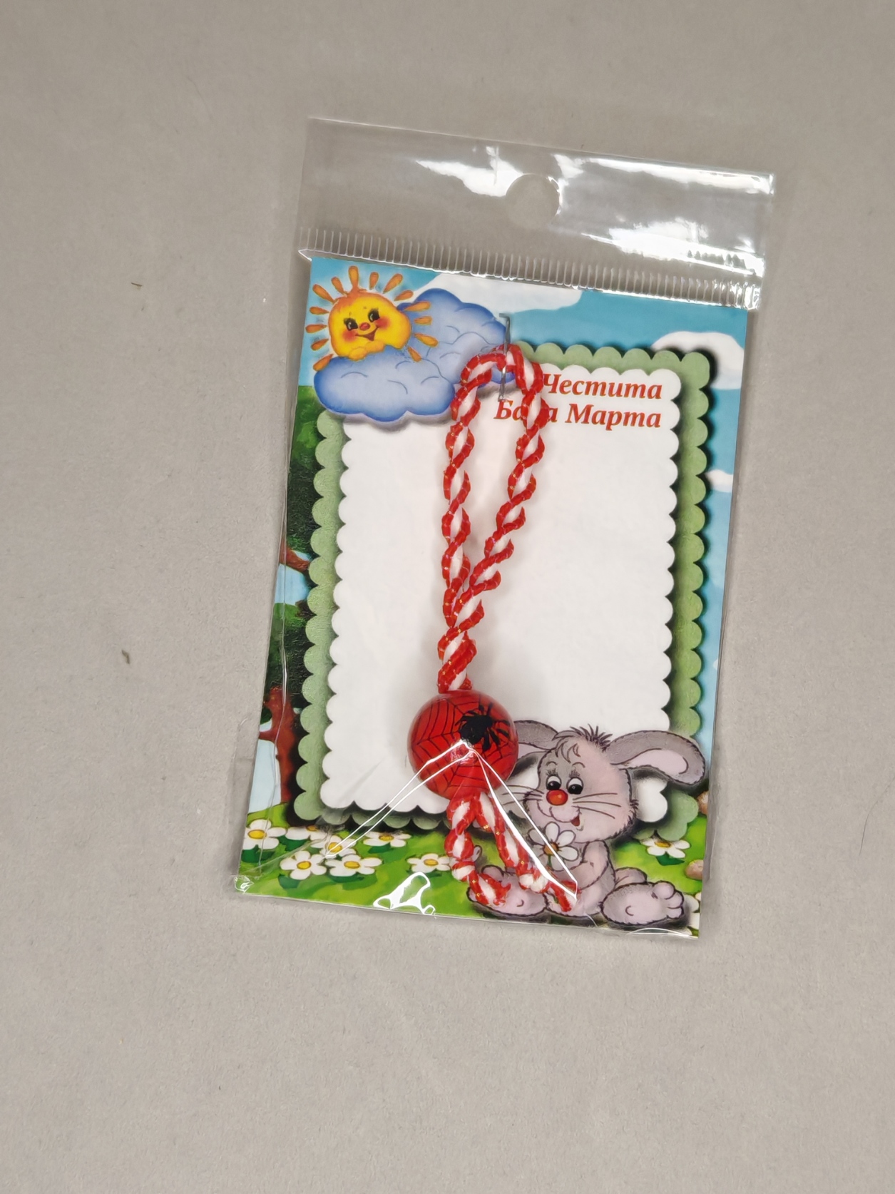 Kindermartenitsa met elastisch koord in wit en rood en een grote Spiderman- of Stitch-bal.