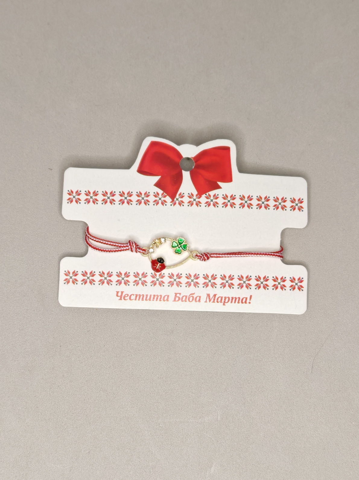 beeldje met een lieveheersbeestje, klavertje en kleine steentjes, met een dun wit en rood koordje.