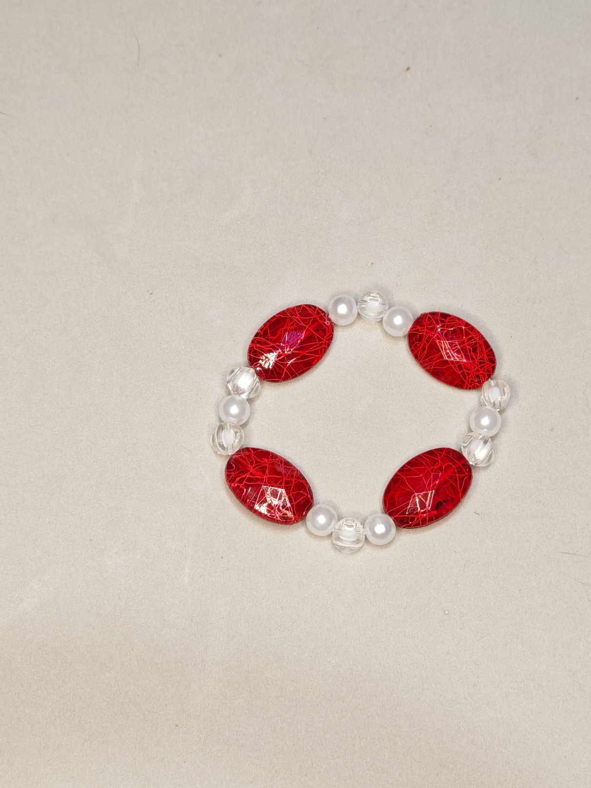 Prachtige martenitsa gemaakt van witte ronde en grote rode ovale kralen.