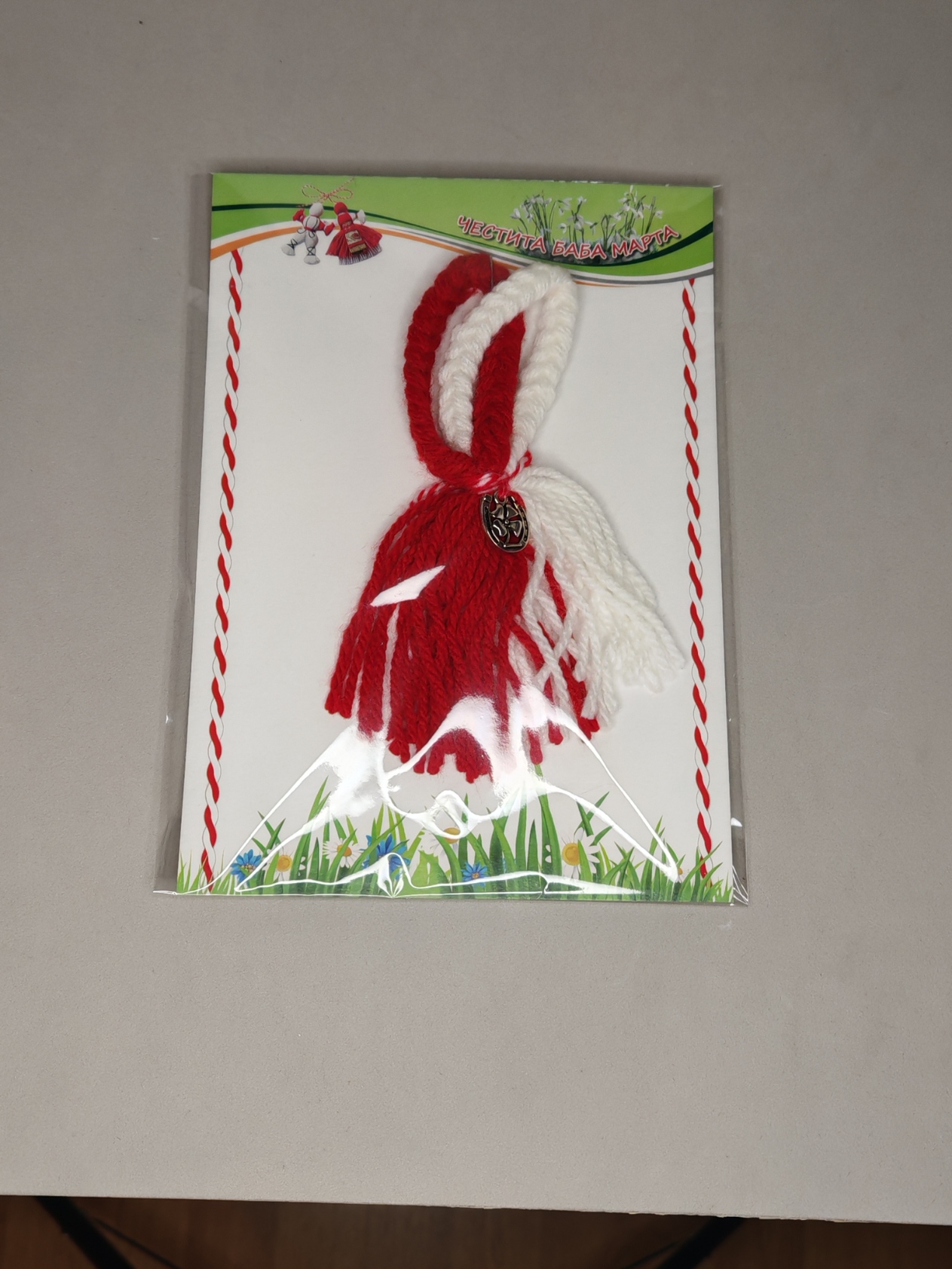 Witte en rode vlechten, gevlochten en afgewerkt met een kwastje en een klein hoefijzer met een klavertje.