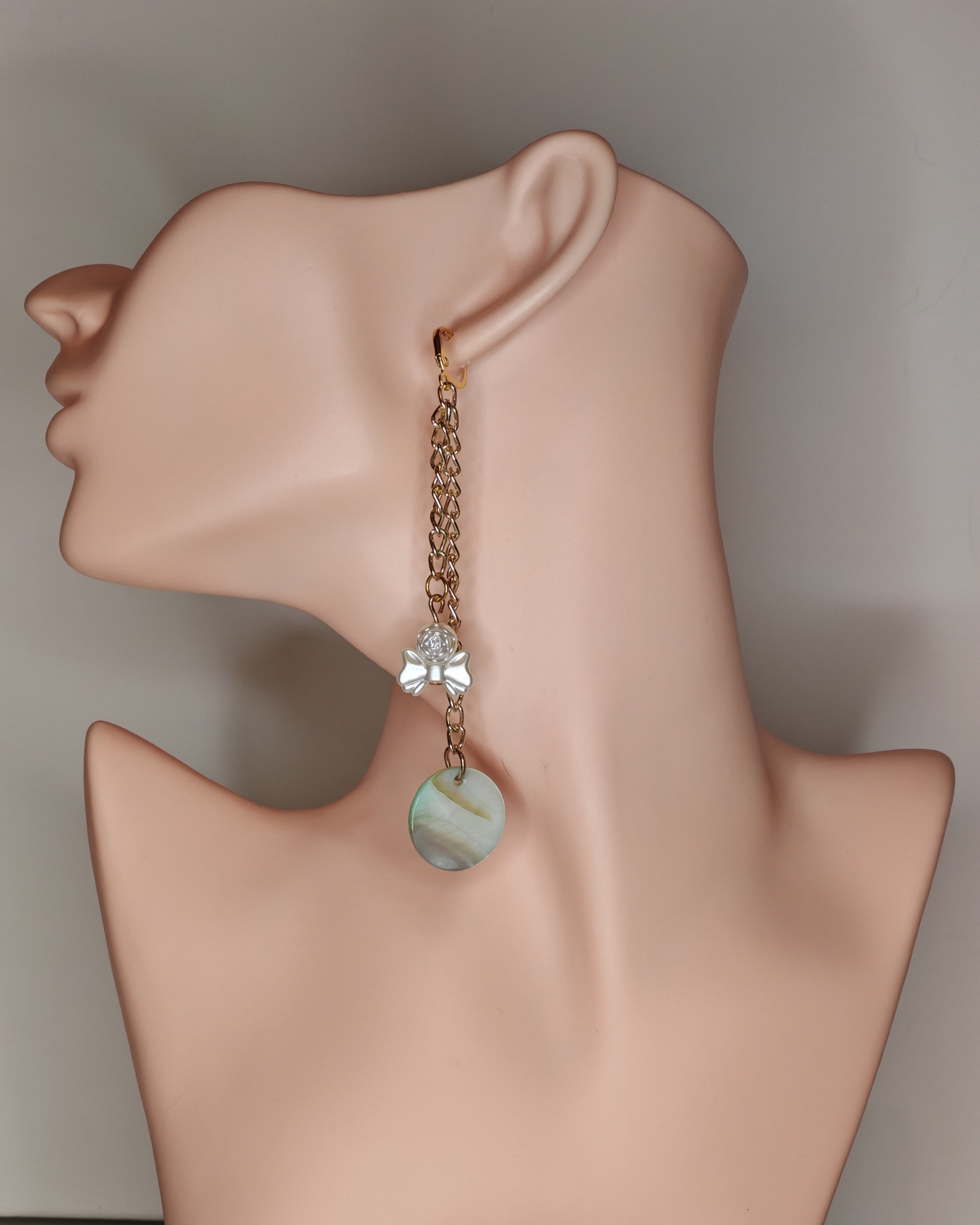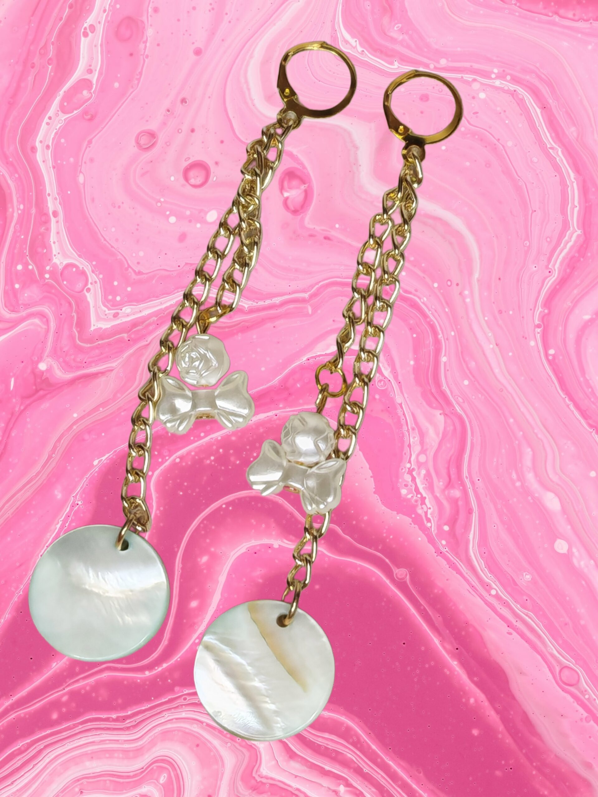 Deze lange, delicate oorbellen stralen pure romantiek uit. De gouden kettingen vallen als dunne lichtstralen, de parelroosjes zijn klein en delicaat, en de parelmoeren cirkels aan het uiteinde weerkaatsen het licht met een zachte, melkachtige gloed. Deze oorbellen zijn perfect voor momenten waarop je zacht, verfijnd en onvergetelijk wilt zijn.