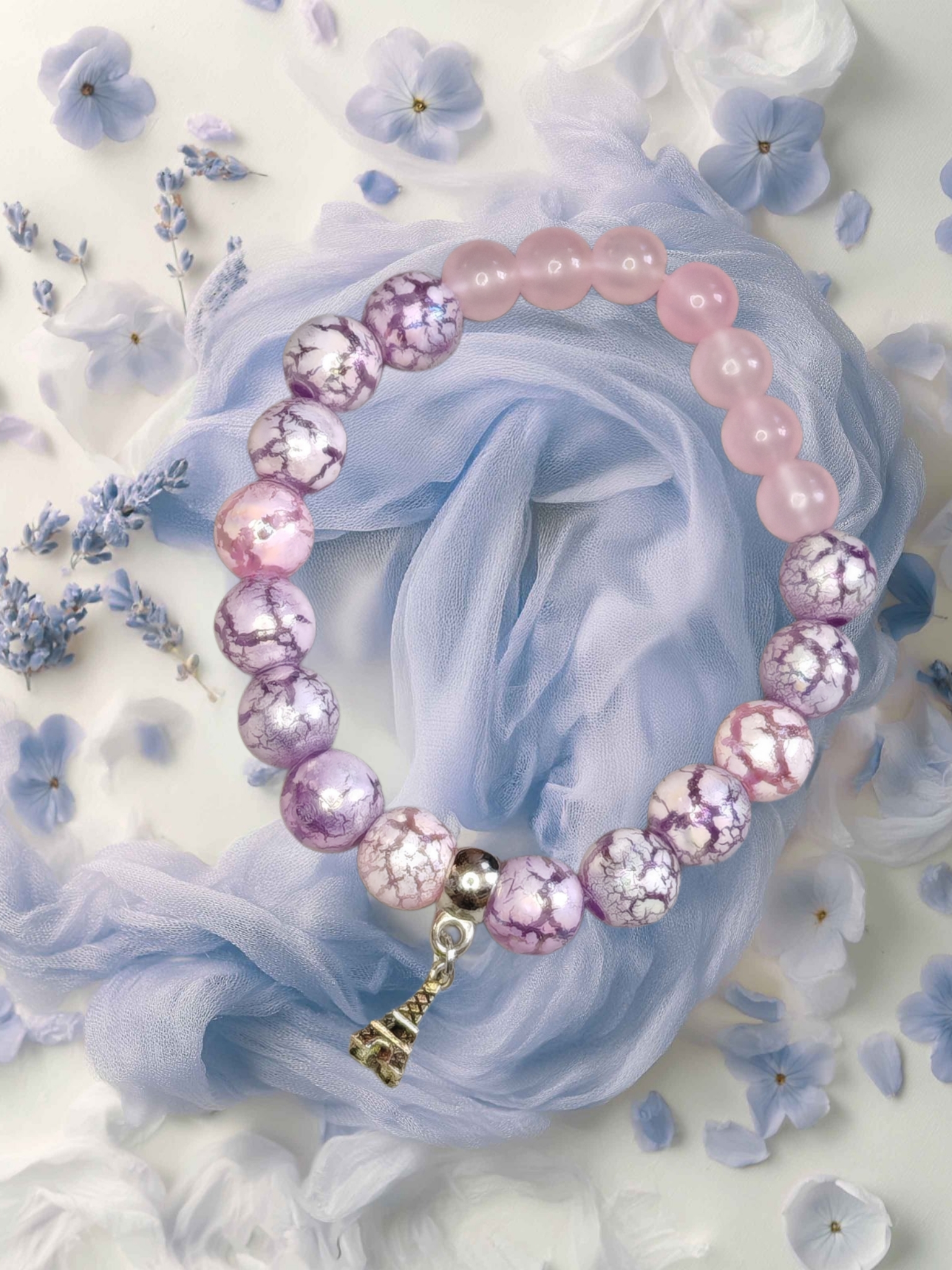 De armband is gemaakt van prachtige kralen in de roze-paarse kleur. De helft daarvan zijn “gebarsten” kralen – met een marmereffect, delicate barstjes en iriserende kleuren van lichtroze tot lavendel. De rest zijn gladde lichtroze kralen, die zachtheid en balans aan het ontwerp toevoegen.