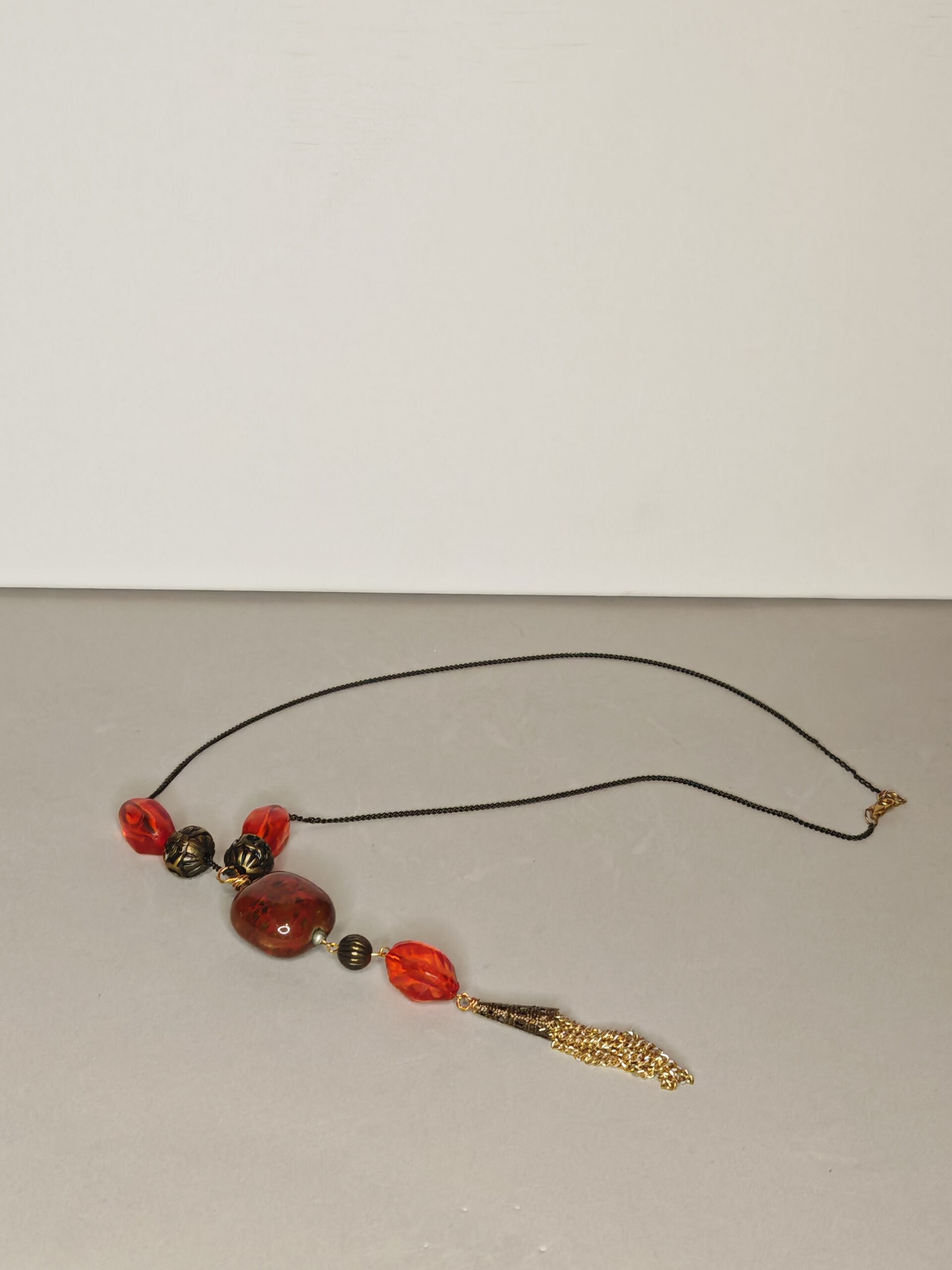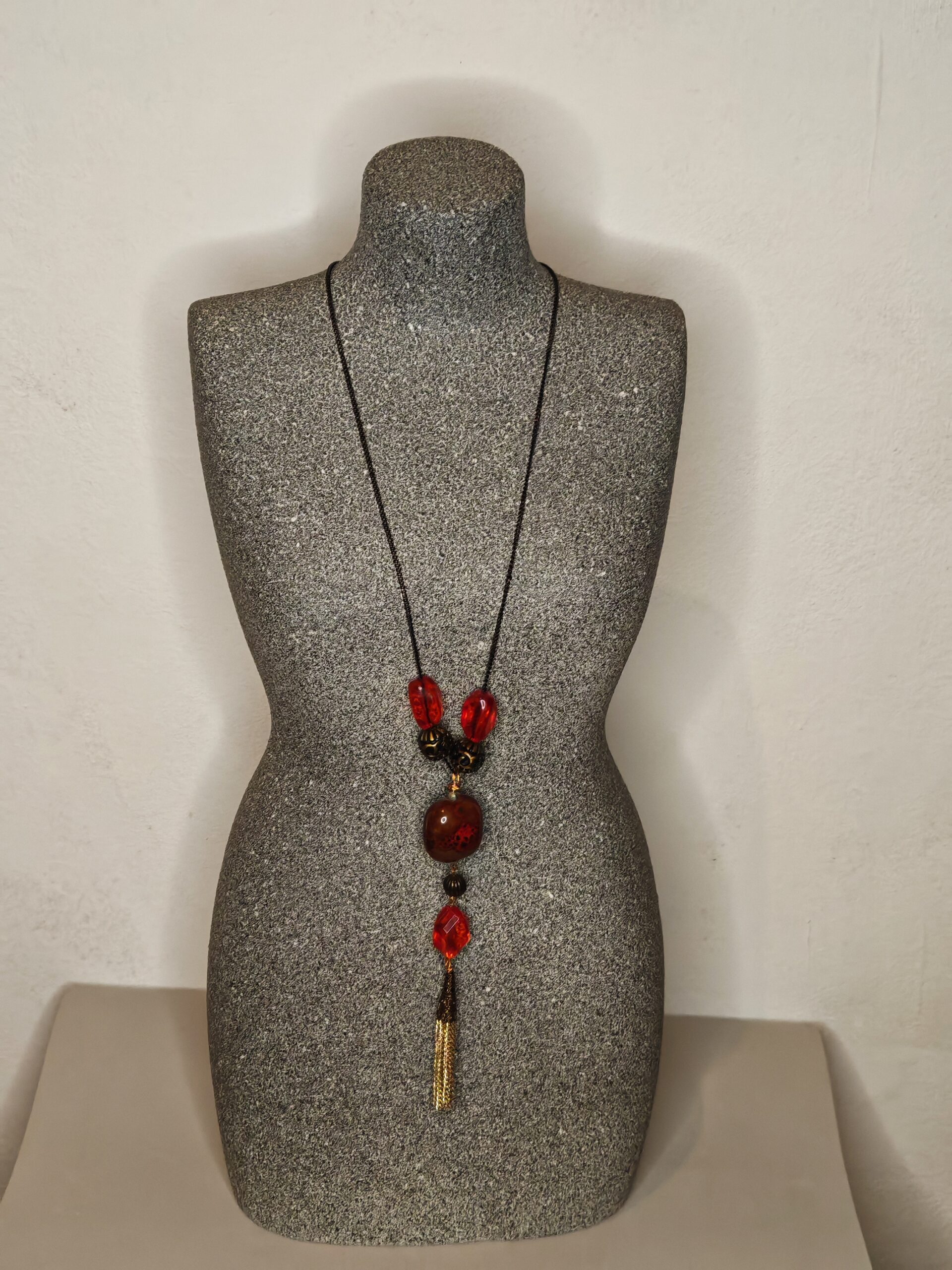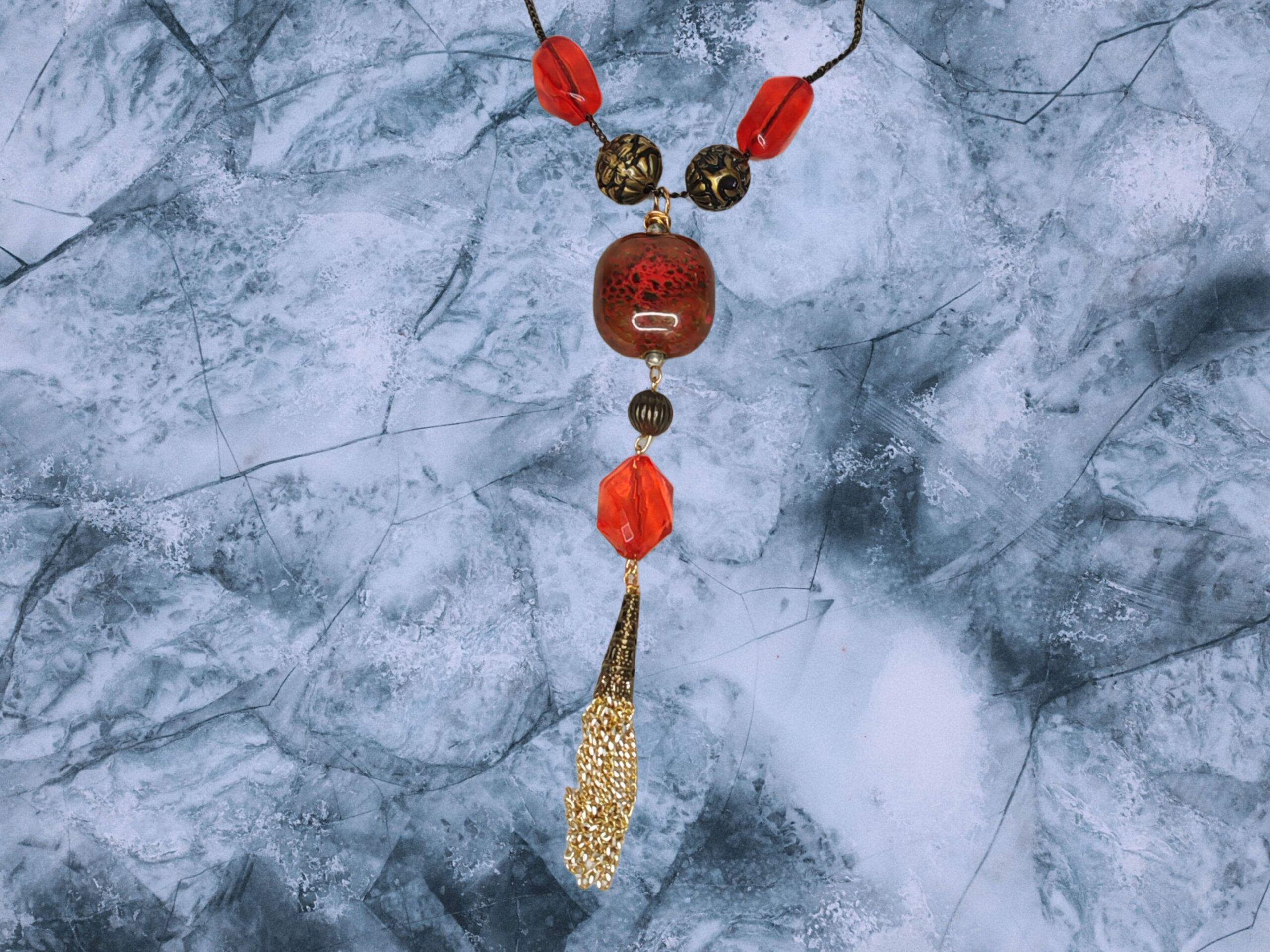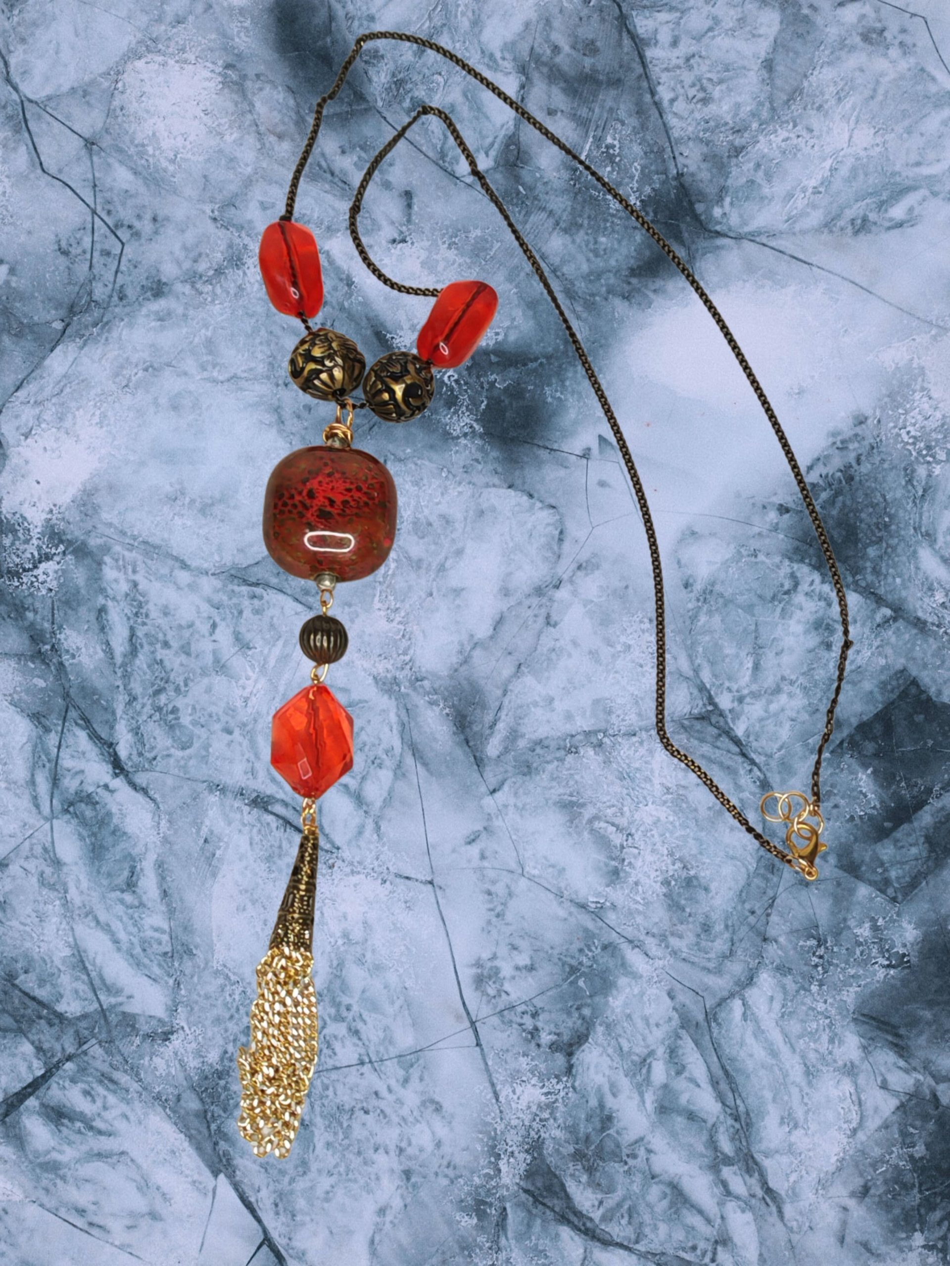 Prachtige lange halsketting in rood en goud met een gouden kwastje en een grote kunststeen als accent. Geschikt voor excentrieke dames. Voor elke gelegenheid.