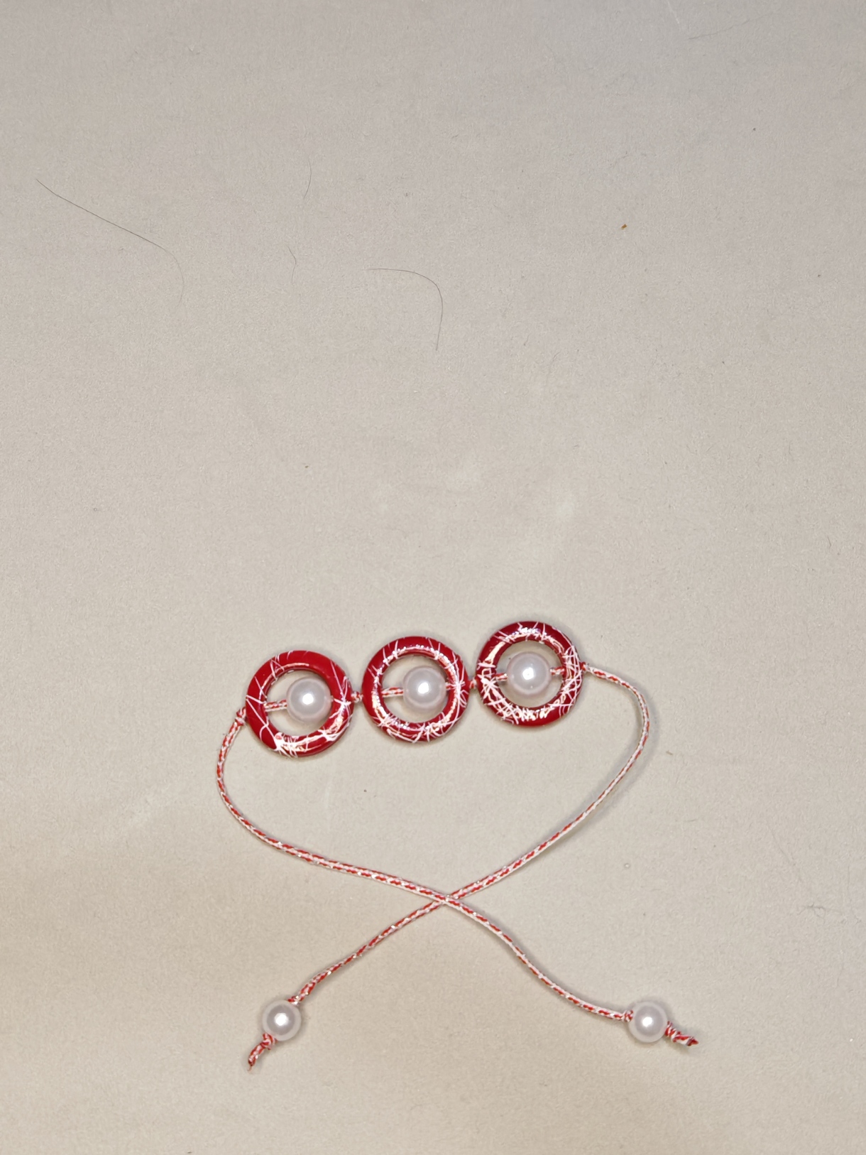Mooie martenitsa gemaakt van witte ronde en rode kralen, met een dun koordje om vast te binden.