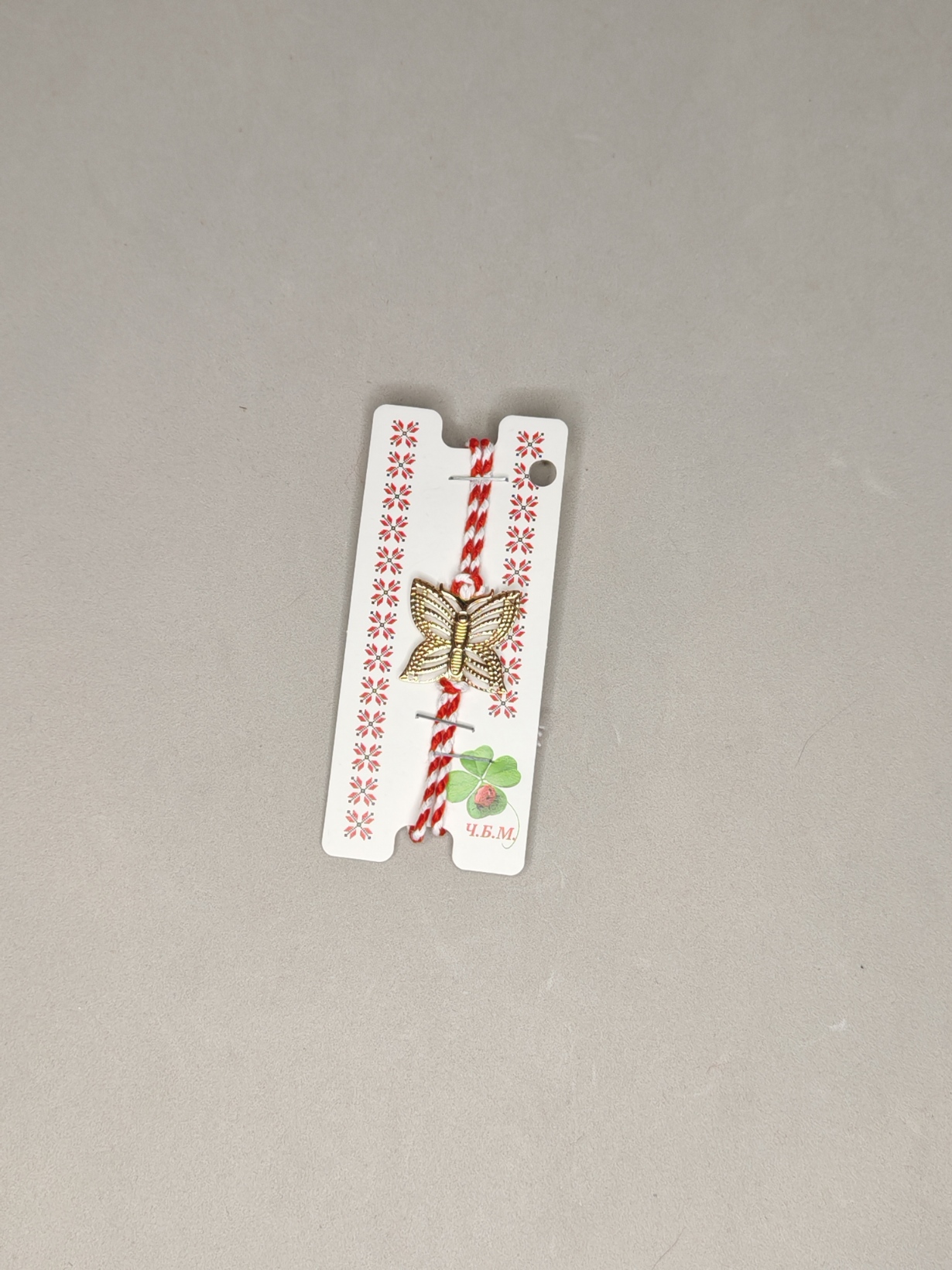 Vlinderfiguurtje met dun touwtje in wit en rood.