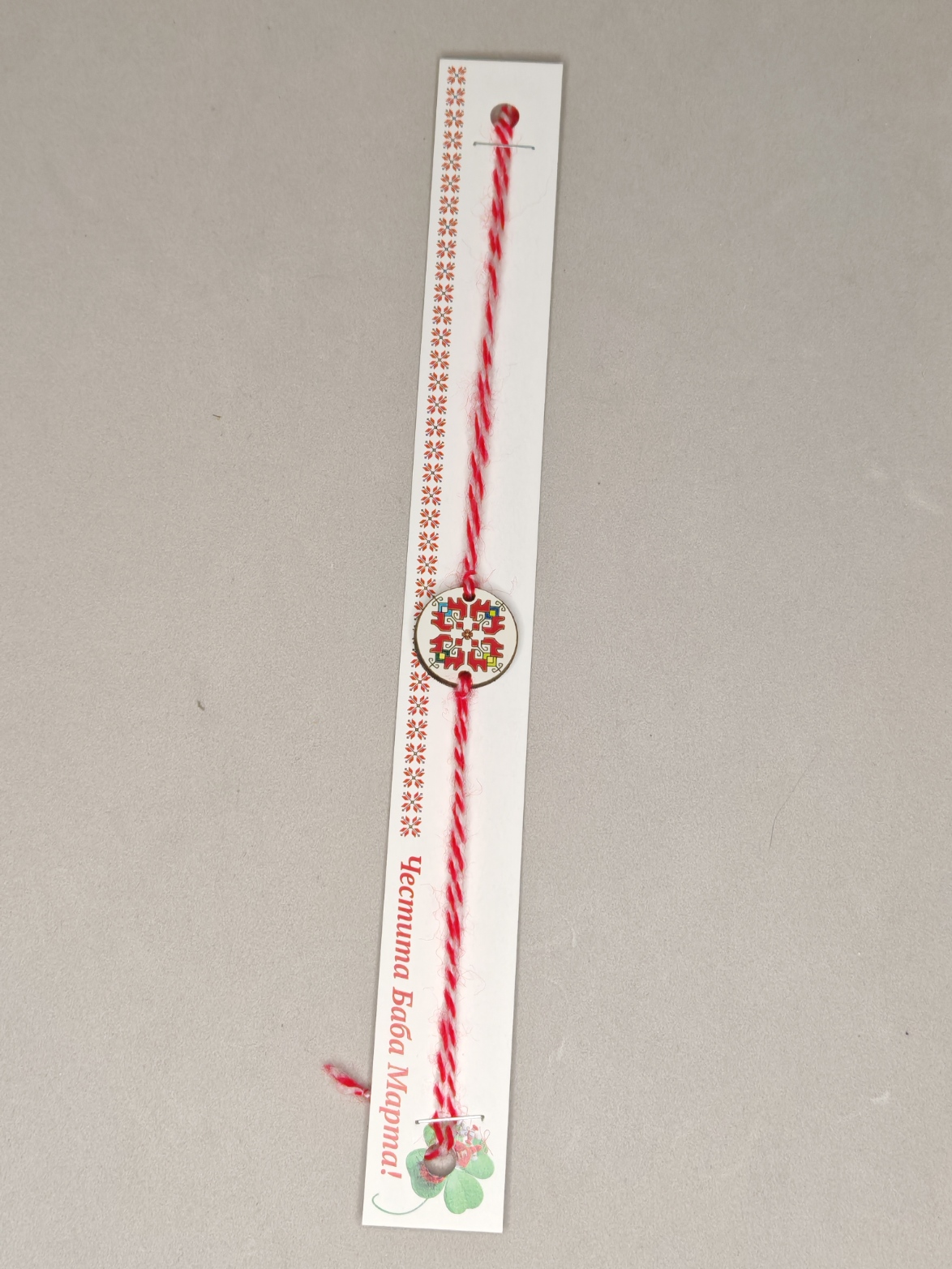 Houten beeldje met een volksmotief en dun, in elkaar gevlochten touw in wit en rood.