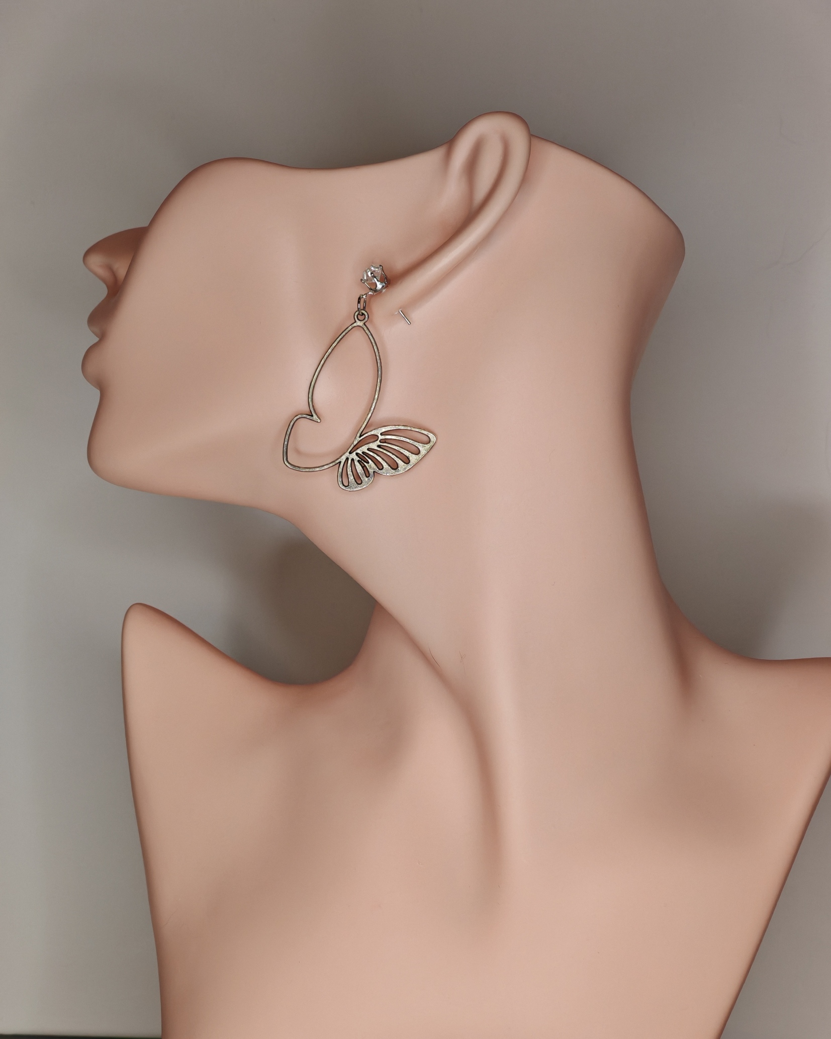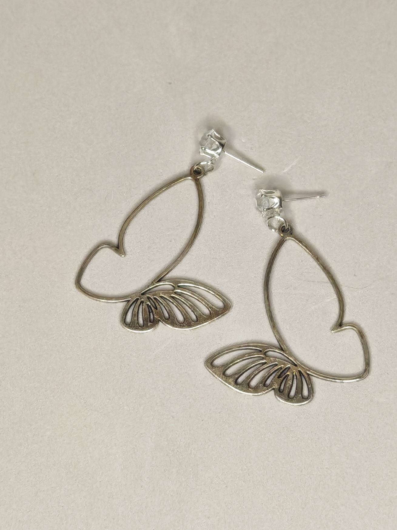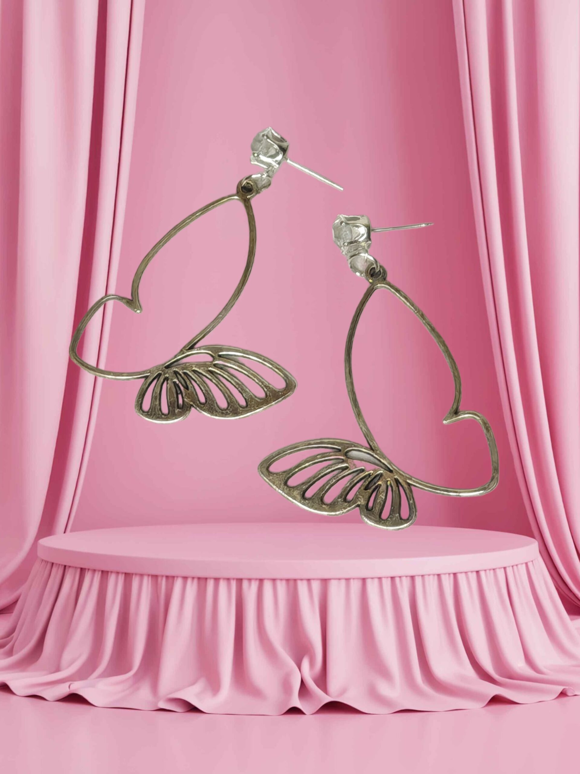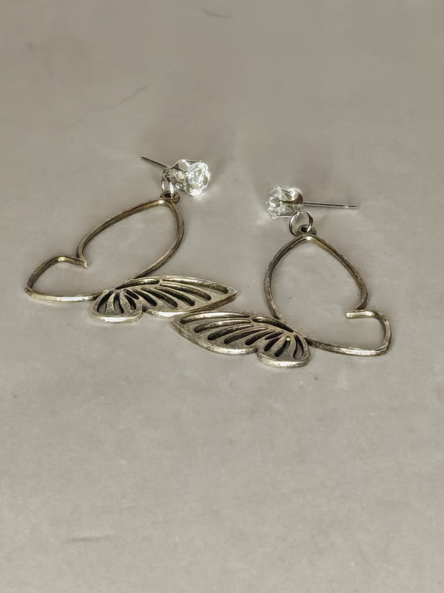 Fijne zilveren schroefoorbellen met transparante stenen. De vorm is een gestileerde vlinder – een hartvormig “lichaam” en decoratief geslepen “vleugels”. Licht, elegant en geschikt voor dagelijks gebruik of een speciale gelegenheid.